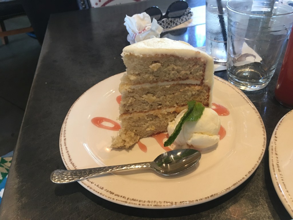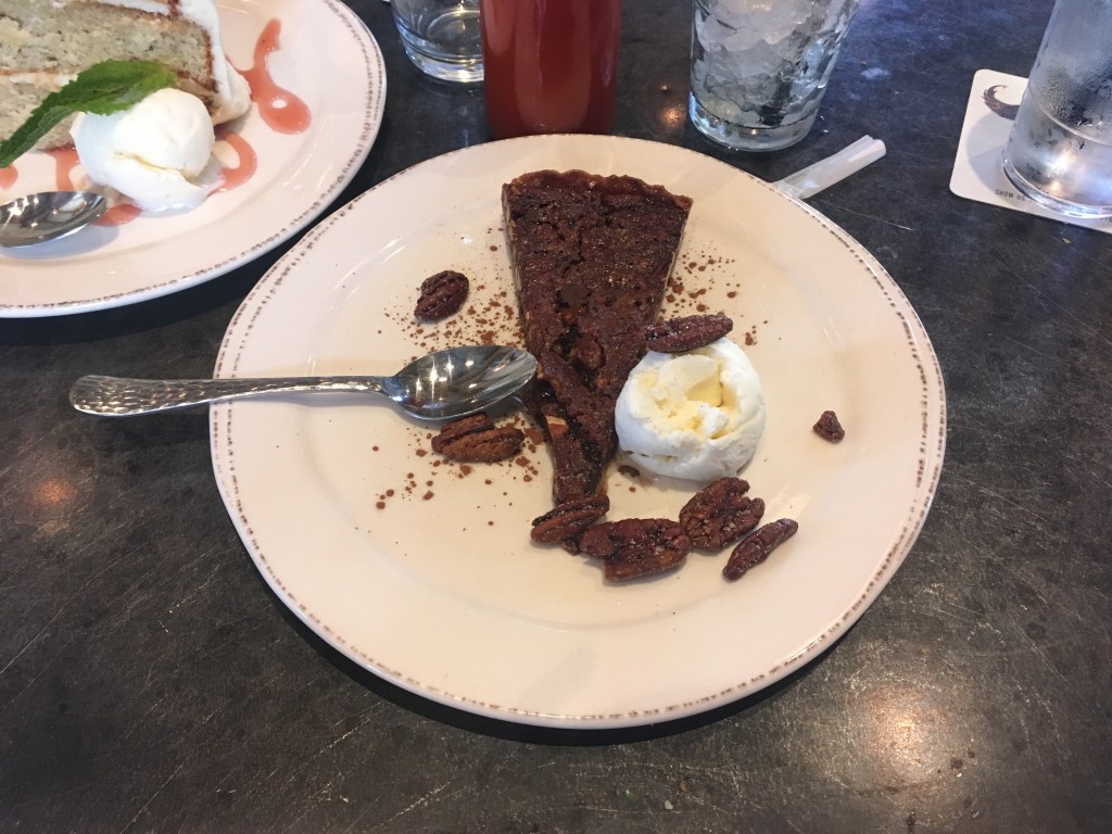 From there we had to try some dessert. The desserts were also very difficult to pick, so we chose two. We decided to get the Hummingbird Cake and the Hamilton County Chocolate Pecan Pie. First up, is the Hummingbird Cake. This is a pineapple-banana cake with cream cheese frosting with a scoop of ice cream and a fruit gastrique. The cake was super moist and the cream cheese frosting went very well. In my opinion it did not need the ice cream but it was a nice way to break up the rich flavor of the cake.
