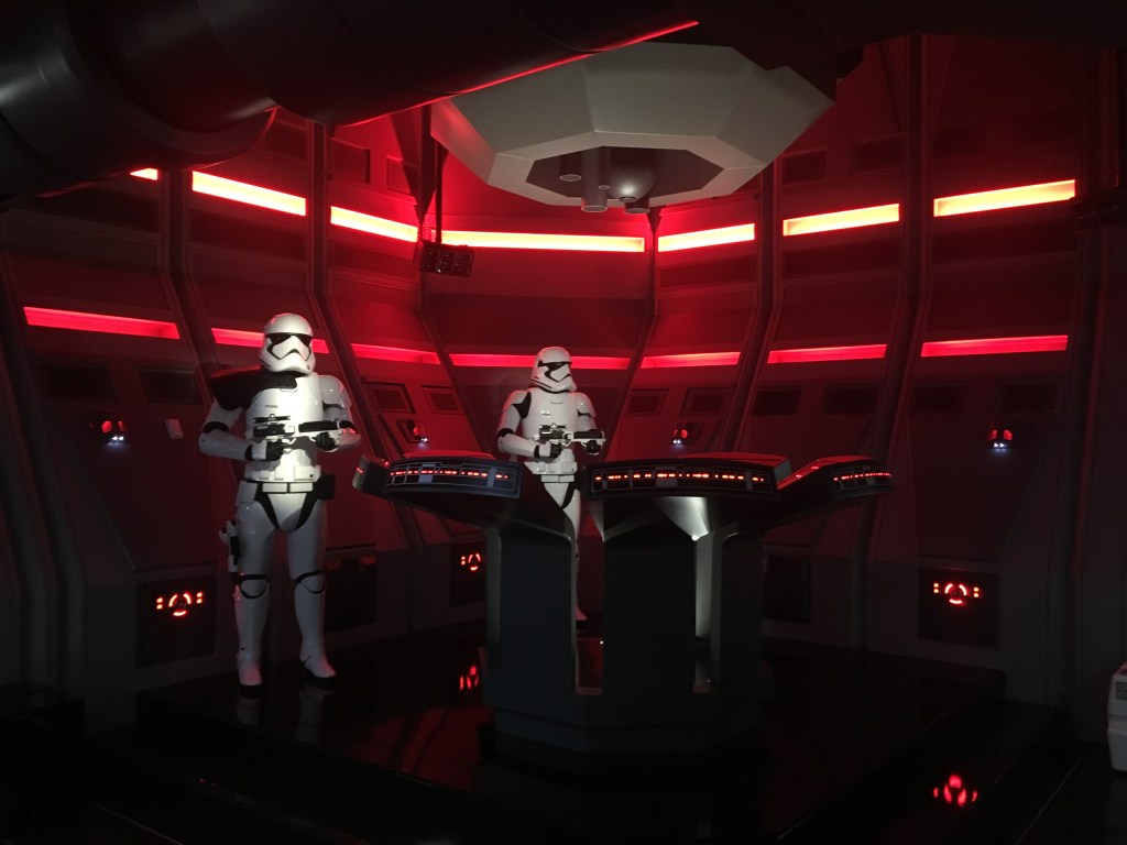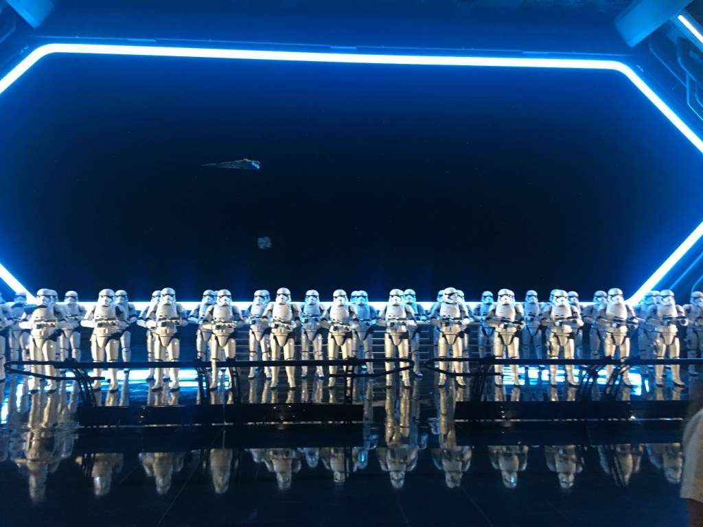 “May the Force Be with You” as you enter into this line queue. Now maybe it comes in at number one because of the excitement of getting into a boarding group, but it still is an epic line to wait in, nonetheless. As you enter into the queue you see all things Star Wars. You see the suits, the guns, the nuances of the world. To me, this comes in at number one because the queue is part of the ride itself. As you get into the pre show, the stage is set for the ride. You exit that pre show and enter into the first part of the ride. From there, the queue becomes part of the ride experience. You exit into a hanger and you are greeted by Storm Troopers. The view is stunning and really puts you in the story of Rise of the Resistance. As you are greeted by members of the First Order you are entering a hallway on the way to your ride vehicle. The Cast Members add to the immersive queue and before long you find yourself on the ride. If you love Star Wars, really take time to look all around in the various rooms and parts of the queue.