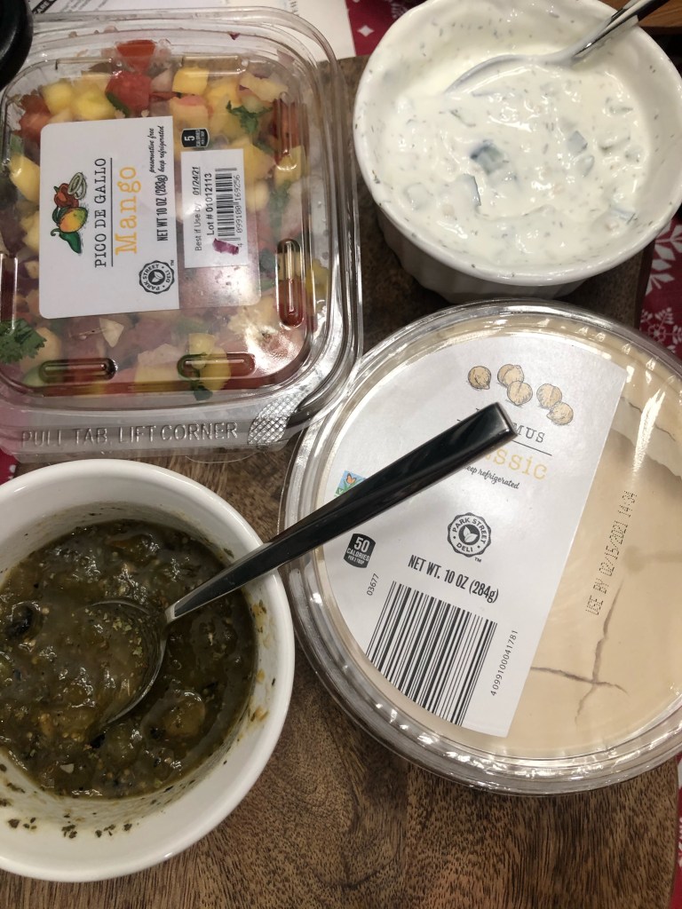 The first sauce we made was a tzatziki sauce. Using sour cream, cucumbers, lime, dill and garlic- it was the perfect fresh creamy tzatziki for the naan bread. This one is easy to make and adds a nice fresh flavor. The tzatziki at Sanna is one of my favorites with the different variety of beads. Another sauce we made was an attempt at one of the spicy dips. We decided to doctor up some pre made red pepper salsa. We added some brown sugar and red pepper flakes to ensure a sweet yet spicy flavor to the roasted red pepper salsa. This one one we just sort of concocted to add a new flavor and dip to our arsenal. It reminded me of one of the red chili sauces at Sanaa. The next dip we chose was a red pepper hummus. We added some red pepper salsa to the regular hummus and it was the perfect blend to add to the sauces. This is a mild flavor to hit a cooling agent from the heat. We also buy some mango salsa to add some variety. This was a easy attempt to do the mango chutney they serve at Sanaa. Lastly, we made a salsa verde mixed with a variety of basil and it served as a sort of “pesto” dip to enjoy. This was another concoction to add to our bread service. This is the fun thing about Disney cooking, you can tweek things to experiment and add some of your own flair to the cooking! All of the sauces were very delicious. It did remind us of the experience at Sanaa. We set up a board with the sauces and a board of the naan to treat it as if we were actually there. Next up from there was cooking the entree we so love!