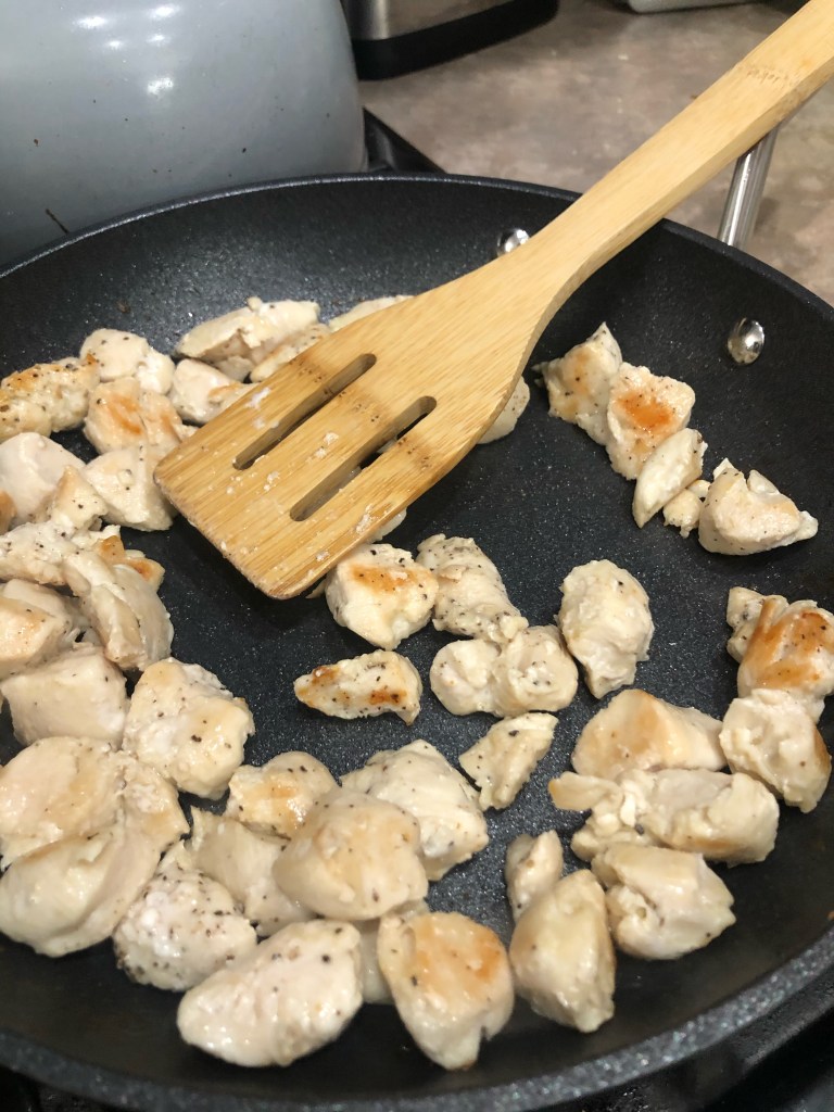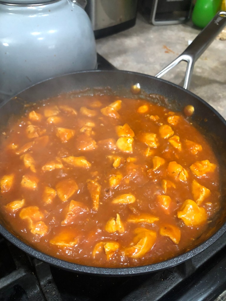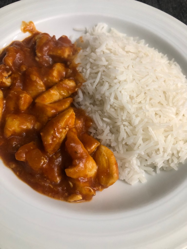 Next we decided to make our favorite entree. We love the butter chicken dish they have. The butter chicken is some of the best they have to offer if you ask me. It is now served with veggies and basmati rice but back in the day, you could get two butter chicken bowls and one basmati rice bowl. We just made the butter chicken and the basmati rice but it would be super easy to add the veggies to the dish. The rice we pre-bought and it was super easy to make as rice is. Boil some water, add the rice, cover and remove from the heat and before you know it, half of the dish was made! We cut up some chicken tenders into cubes and seasoned them with salt and pepper in a pan until the chicken was cooked. Now, if we wanted to get fancy, we could have attempted to make the butter chicken sauce, but why do that when you can buy a pre made jar for a quick dinner option. That is just what we did, the jar of butter chicken sauce was from Aldi and it was super simple to add to the chicken. When the chicken was cooked, we added the sauce and then simmered for some time. The sauce thickened a bit and coated the chicken completely and the meal was done! We plated half rice and chicken and before you knew it, a Disney meal was ready to be had at home. Photoed below is the final dish!