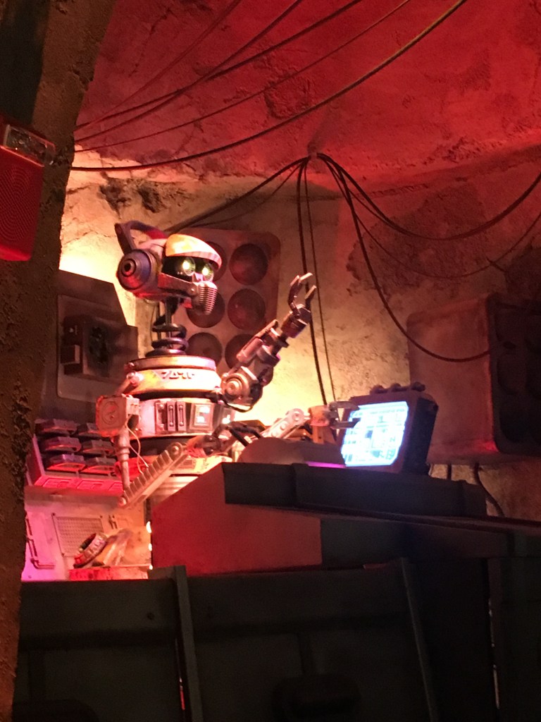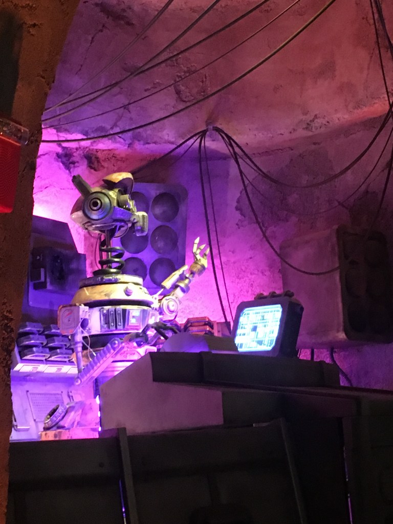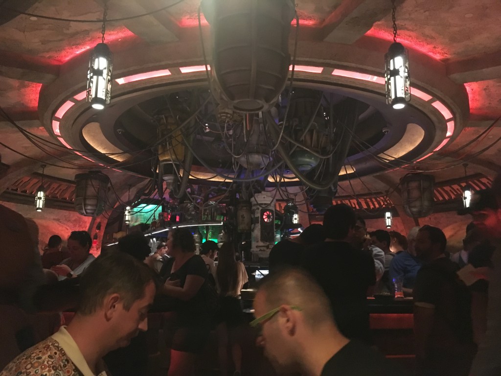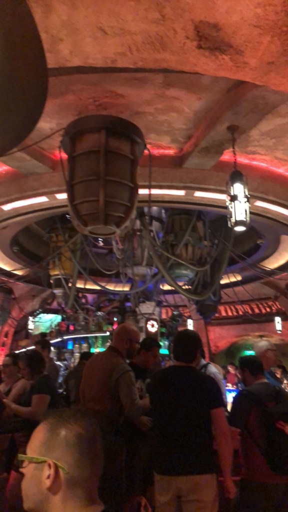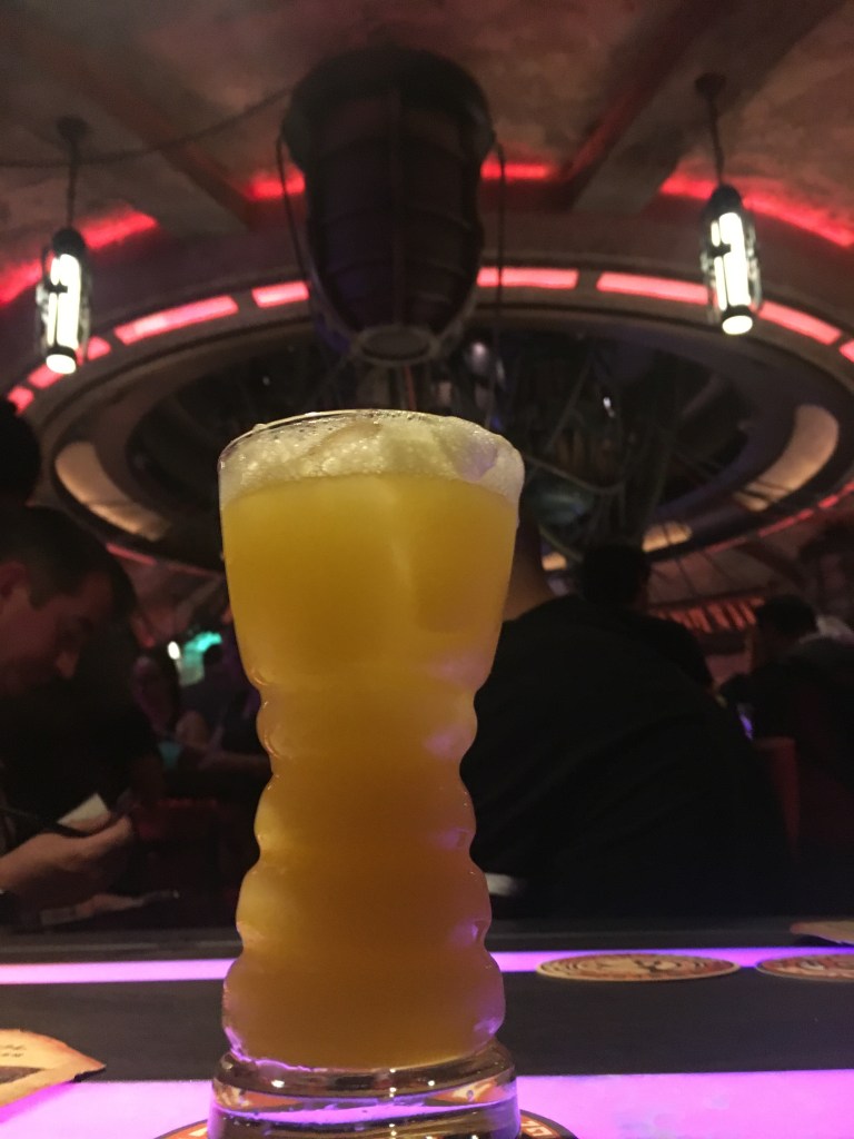 As you enter into the cantina, there is an atmosphere that has you tapping your feet as you are walking in. The music fills the air and from the moment you walk in, you are introduced to the galaxy’s favorite, DJ R-3X. The music is catchy and you might hear some of your favorite tunes that fill the air. Everyone’s favorite cantina band meets a remix and you feel like Han and Greedo might get into a tussle. Remember to enjoy the drinks but don’t keep your head down. The bar has some fun features, so keep looking around. The wires fill the ceilings and you see some tanks that are filled with exotic Star Wars creatures and you cannot help but feel immersed in the action. All of the decor is spot on and you feel like you really are right there in a Star Wars Movie. Seating in here is limited and you will want to make sure you get a reservation. The seating can have you grouped with others (pre-covid) and that adds to the fun. We will be updating this once we have a chance to experience it again, but it does seem this has changed. No matter what the seating arrangement has in store, this will not add or subtract from the experience. They also have a two drink limit and a time limit when in the cantina. This is to get as many guests in to experience the fun as they can. We were just above the time limit and enjoyed two drinks each. The time limit is nothing to worry about as I do not think they really police it too hard. They do bring the check once you have had the second drink brought to your table so they can start the check out process. The experience and theme went smoothly so do not worry about the time limit.