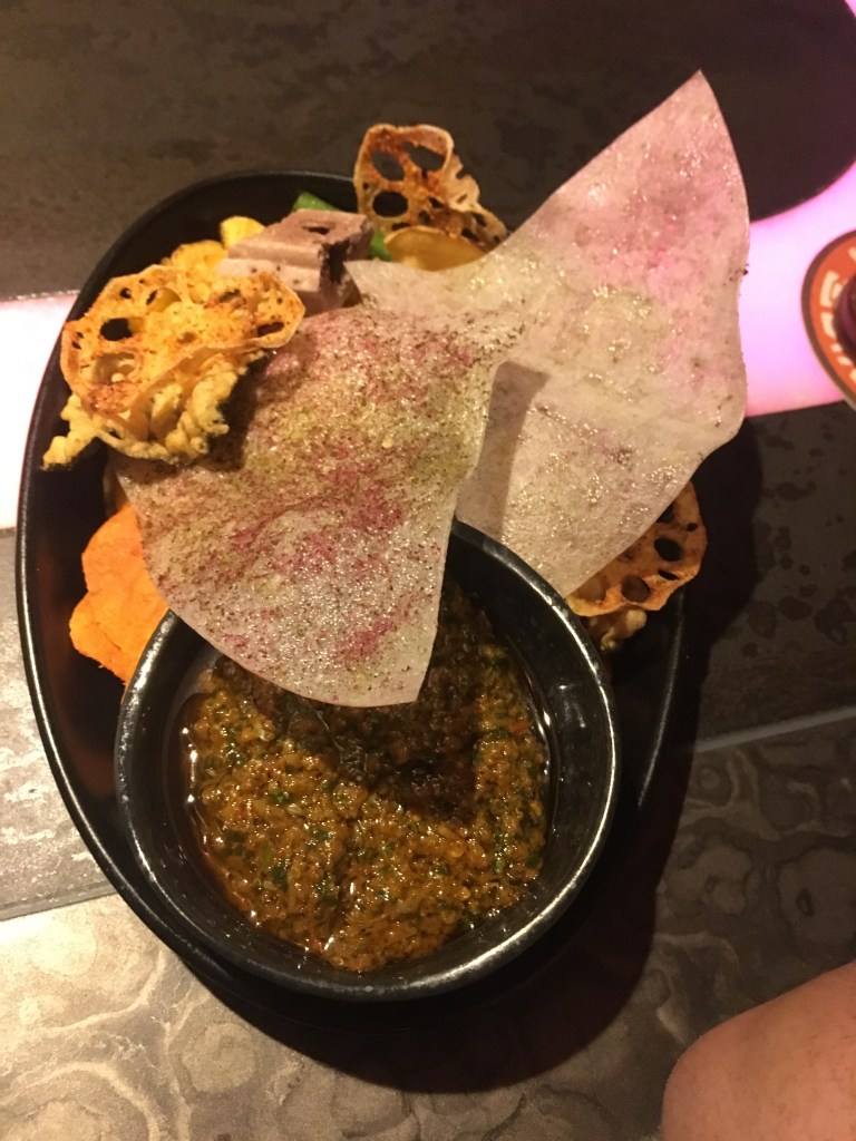 Oga’s Cantina is not really known for the food options, but they do have a couple to choose from. The options are more like appetizers rather than actual entrees so make sure you don’t come hungry. There are only two options and both are very exotic. If you are not one to want to try new things, maybe pass. I will say, Disney did a great job of making food to really fit the exotic Star Wars type, but maybe something more simple might have been a better play. First up, we tried the Batuu Bits.