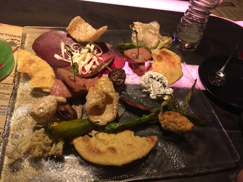 This is called the Happabore Sampler which included Cured and Roasted Meats, Cheese, Pork Cracklings. This one was pretty exocic. I would not recommend this one. The meats and cheeses were not that good and I am not a fan of the pork cracklins myself. I do realize some people may like this, but it was not for me. I am glad we tried it, as it was fun to partake in the fun of the land, but next time we will pass on this.