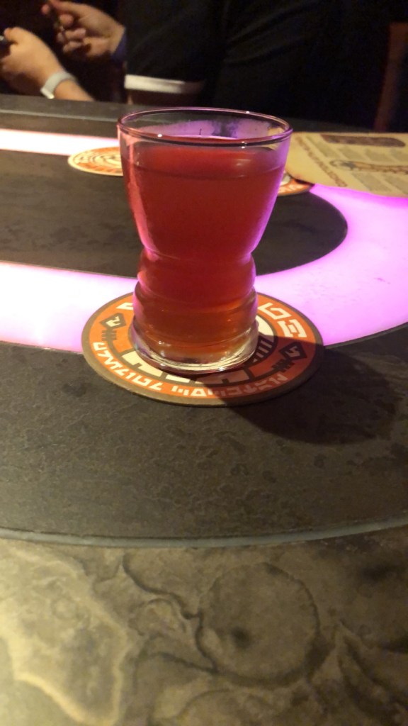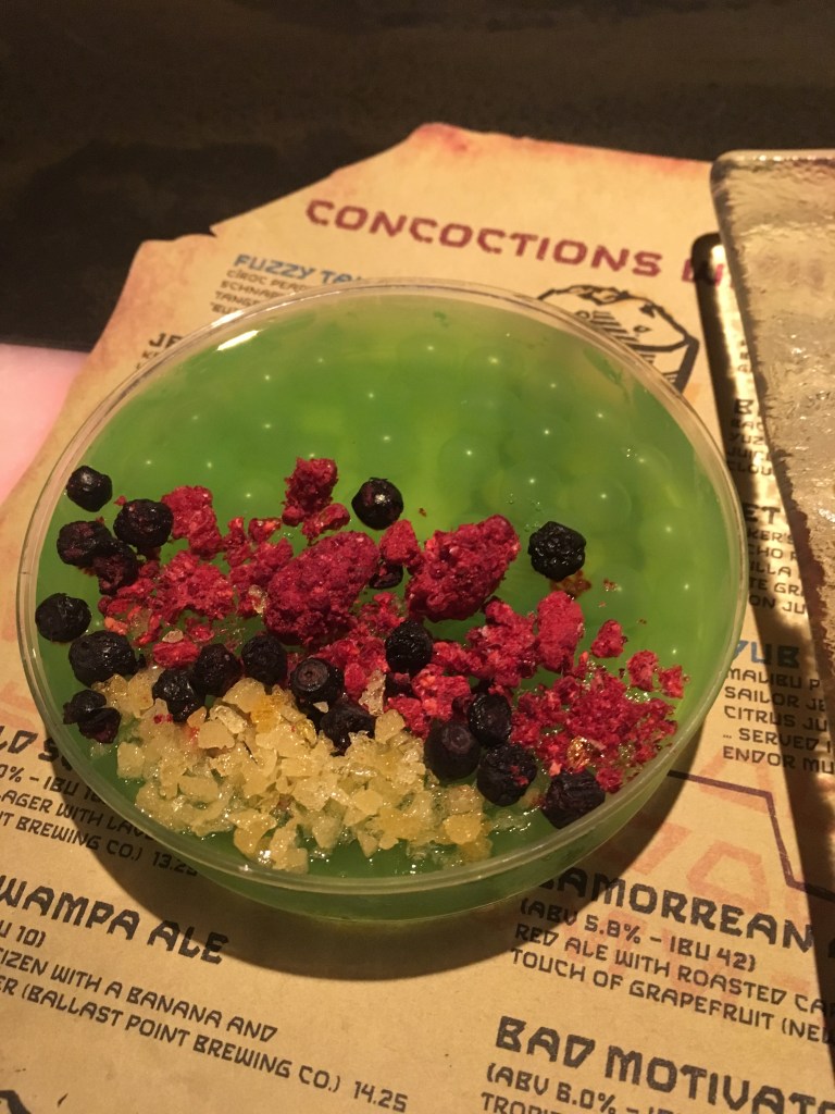 Finally, we decided to try a provision with alcohol. It is called the Rodian Ration. This was in a petri dish and consisted of Tito’s Handmade Vodka, Dekuyper Pucker Sour Apple, Green Apple, Sprite®, and Boba Balls. It reminded me of a jello with boba balls included. The ultimate jello shot if you will. This was an interesting experience but also very good. I would recommend the drinks before this one but it was fun to try. After all, you are in another galaxy after all.