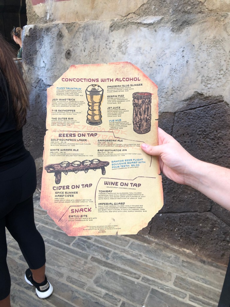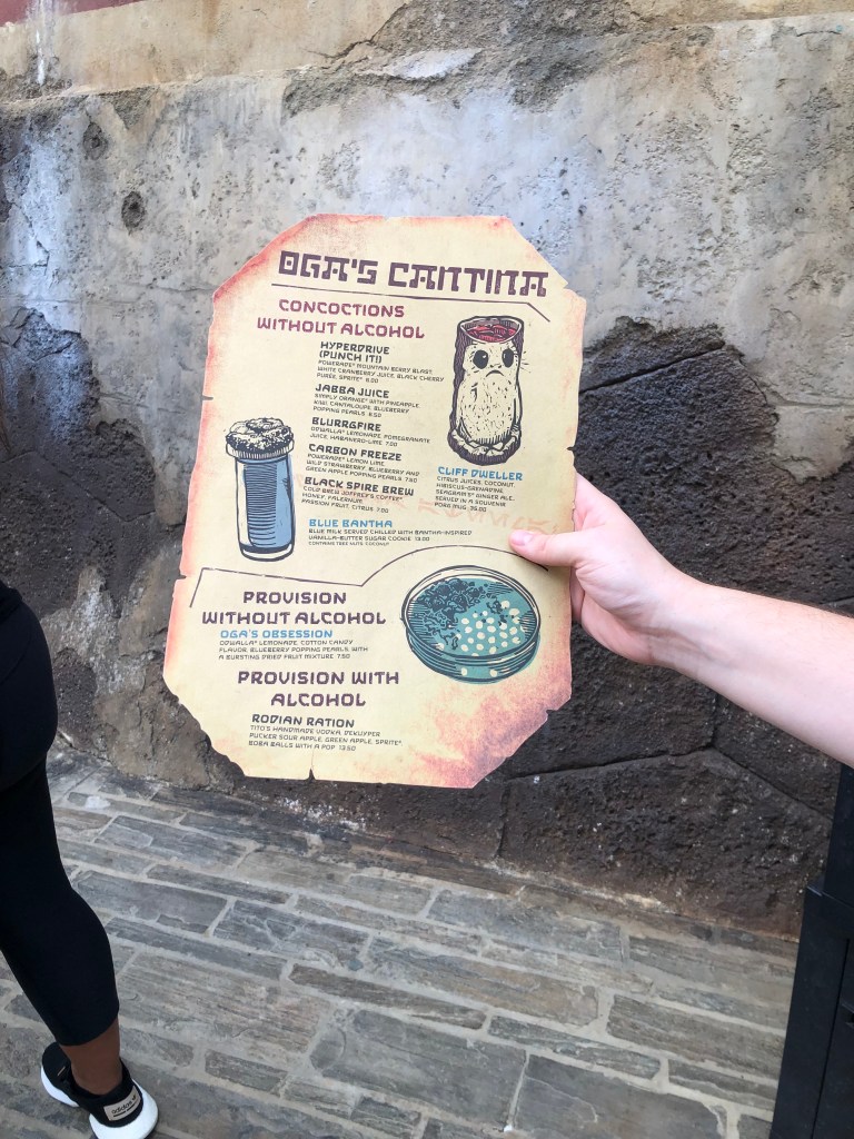 Hello friends, welcome back to Muting and the Mouse! We continue to escape into the magic this week from all over the world as we dive into another restaurant review. Disney is known for food as we have discussed before. This restaurant is not known for its food, but for it’s drinks. Pack your bags as we head to a galaxy far, far away. Okay maybe not that far away. It is found at Hollywood Studios. As you are taking in the wonder that is Star Wars Galaxy’s Edge, make sure you make it a point to check out the best cantina in the galaxy. Oga’s Cantina will have you escape into that Star Wars magic. The restaurant is themed so well, has some fun drinks, interesting snacks (maybe pass on these), and the best droid DJ that you will ever meet. The atmosphere is one that you can feel as you walk into the cantina. You swear you might have been there based on how some of the cantinas are portrayed in the movies. Everyone is gathered in and there is very little space for sitting, most is standing room. If you are lucky enough to get a seat, take it all in. If you are not, still take it all in! The cantina atmosphere makes you feel like you are in the heart of the action with the DJ playing in the background with the servers making drinks and peculiar sights and sounds happening all around the cantina. Let’s dive more into the restaurant as we see some of the theming and some of the drinks we tried. Now, we were able to go back in 2019. With some of the changes due to Covid, stay tuned as we will be updating you all on some of the new protocols later this year. The menu has not changed and we are very excited to get some of our favorites and try some new ones on our next visit.