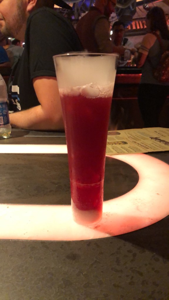 Next was the Fuzzy Tauntaun. This drink was my second favorite drink we tried that day. The fun name, the specialty drink, and the extremely weird but fun sensation from the foam made the drink come alive. This drink consisted of Cîroc Peach Vodka, Bols Peach Schnapps, Simply® Orange with Tangerine, Pure Cane Sugar, and “Buzz Button Tingling” Foam. The drink was very sweet, yet refreshing with the tingling foam that makes your lips feel a slight numbing sensation. This is so weird but oddly satisfying and has me wanting to try it again. Make sure you give this one a try, it will have you talking about it in one way or another.