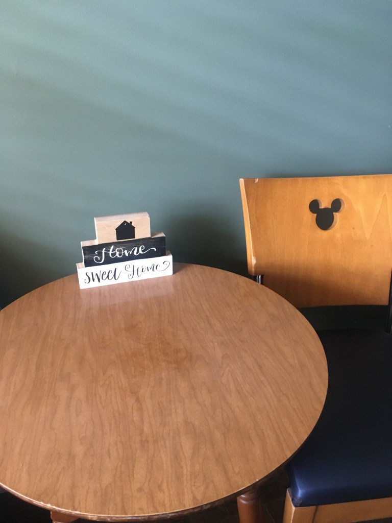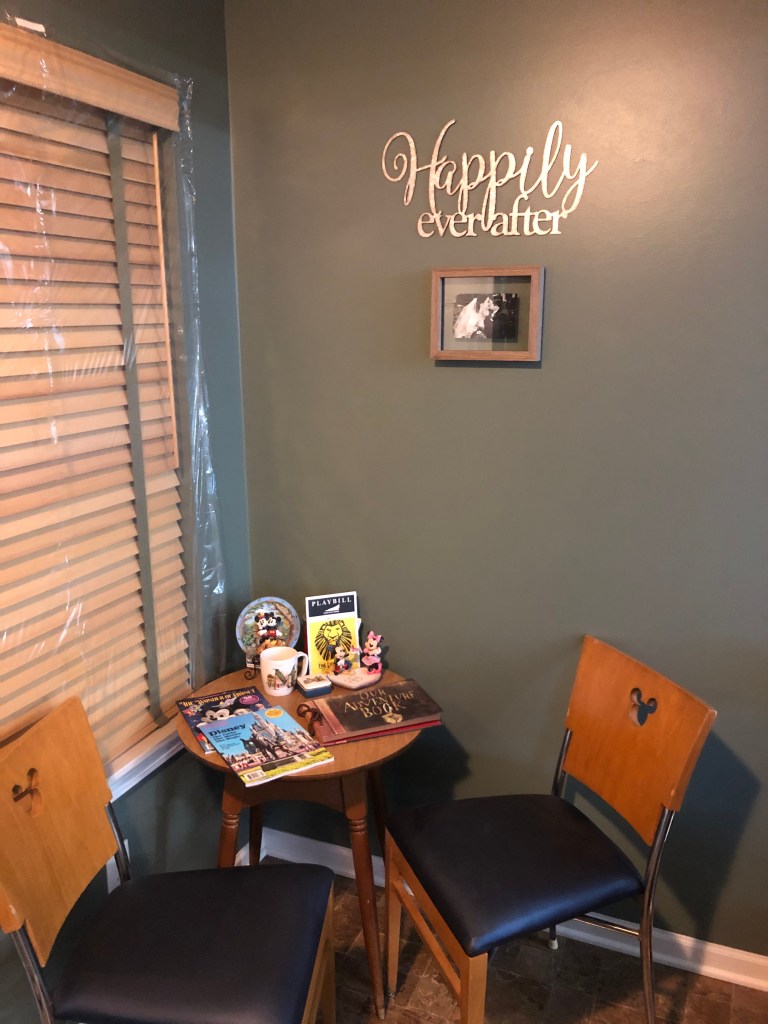 Next up, as we enter into the home, just at the entrance is an extra magical touch. You find a table and some chairs. Now this is not just any old table and chairs. The table is an add on but the chairs is where the magic shines. They once again have the Mickey shape in the backrest of the chairs. This is only the beginning of the magic. These chairs are actually from an All Star Movies Resort! The chairs were removed as part of the remodels of the hotel and they were bought at Cast Connection at Disney. My wife purchased these to own a piece of Disney for her future home and boy do we love them. It is fun to look and see the magic that brought so many people happiness over the years. It is a nice addition to the home and has made a nice Disney corner as a place to enjoy some coffee. We even added some of our favorite Disney magazines and nicknacks to decorate the table.