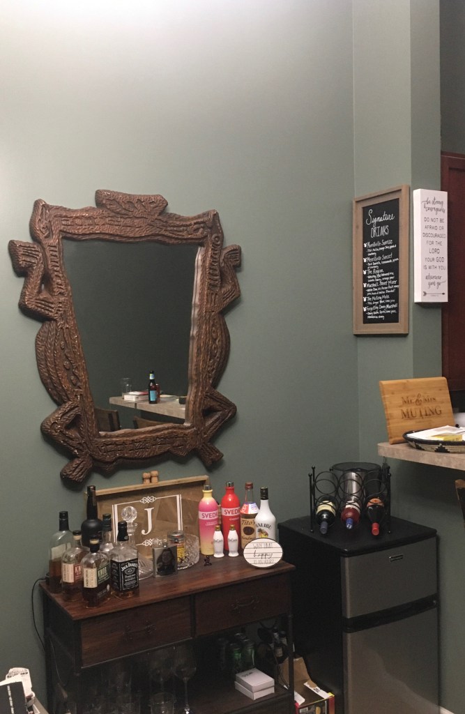 Moving into the living space/room we have some fun Disney touches as well. The magic of Disney is something special, and we are blessed to have made a special brick to commemorate our day of marriage. These bricks used to be outside of the Magic Kingdom. When the park began renovations they tore up the bricks and made some available for you to purchase as a remembrance to the ones outside the park. Now we obviously did not have one of those bricks that were placed for years outside the park, but we took the opportunity to get a brick to take home. Next, we have so many photos of our trips to even know what to do with. I took one from each park and decided we should get some canvas’ made to show the four parks. They sit above our couch and are a really nice touch to see the park icons every day. There is also the plaque of the famous walt Disney Quote “ Here you leave today and enter the world of yesterday, tomorrow, and fantasy”. We love this quote and it fits so well in our living room with the four park photos. It makes you feel like you can enter that magical place just by looking above our couch. As you continue on in our place you come over to our bar area. The bar has one special touch. Above the bar is a mirror. The mirror once again is a special Disney piece that was made available for purchase. Our friend who lives down in Florida got it for us when she saw it and it is the perfect addition to the bar. The mirror was found in Disney’s Animal Kingdom Lodge and is the perfect add on since our wifi is named after the resort my wife worked for during her Disney College Program. That reminds me, our last Disney touch in the room helps you find the name of our wifi. You will see a replica of the entry sign that can be found at Animal Kingdom Lodge and you can’t help but smile at the fun Disney sign.