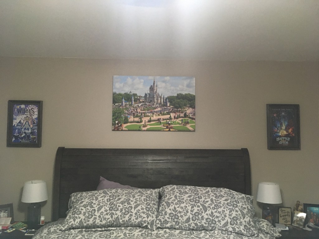 Walking into our bedroom, we decided no to go all out but have some really nice personal Disney touches. Above our bed we see a giant canvas of the hub at Disney’s Magic Kingdom. This was a photo we had taken on one of our trips. It is a fun photo-op that zooms in and out and can be found on our home page on the website. The photo has us in it and provides a fun “Where’s Waldo” type of thing for people to see. On either side of the bed we see two park fireworks posters. On one side we see Wishes. Wishes was such a fun fireworks show and provided a fun personal touch for both Abby and I. I love to have this one in our room because it reminds me that without knowing it, I once made a wish that would come true during Wishes! That wish was to find a Disney fanatic like me to marry, and that did indeed come true! On the other side, is Happily Ever After. This one is personal too as it was the perfect transition to that wish I made a while ago. These two fireworks shows add the love and magic of Disney that we see each day when we wake up and go to bed.