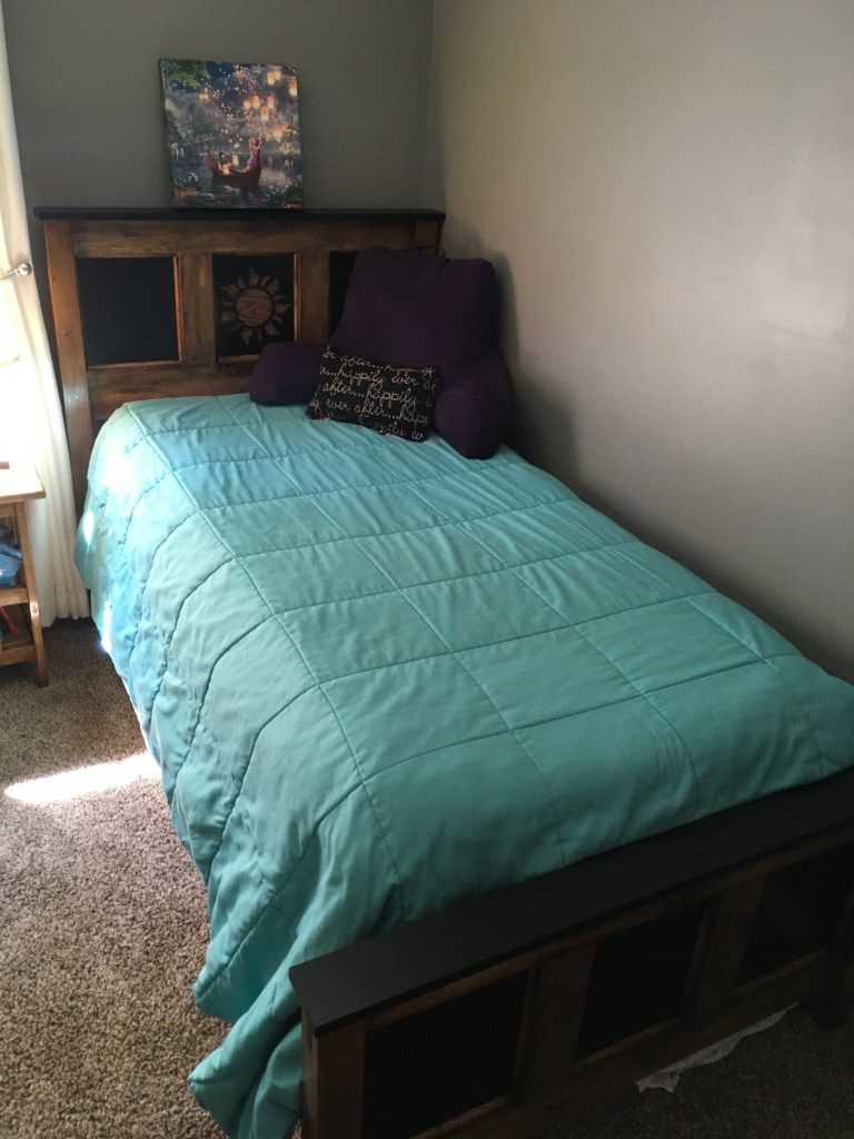 Continuing into the guest bedroom, our first Disney touch is the bedset. My father-in-law came in clutch again with making us a bed frame to add some magic. He did not only make the bed set, but he made it with some Disney flair. At first glance you see a beautiful bed frame with a sun in the headboard. Then you look longer and you realize it is the sun that is found on the lantern from Tangled! My wife’s favorite movie is Tangled and her dad did a wonderful job adding the magic to a simple item. It is stunning and so much fun for guests when they see it.