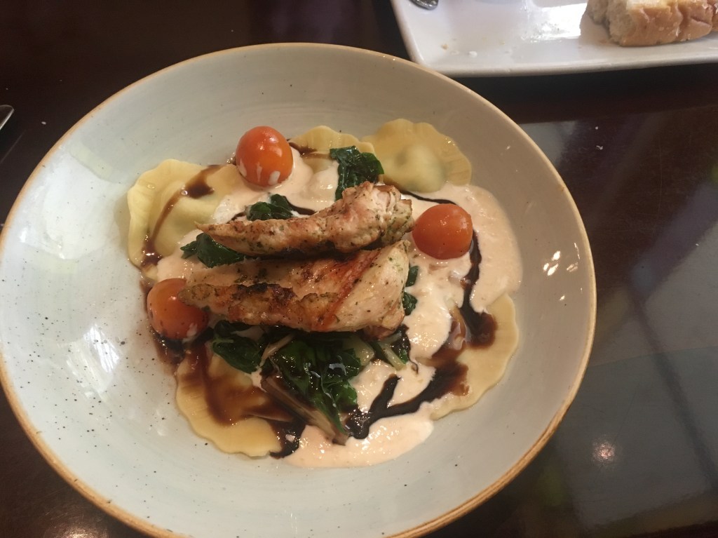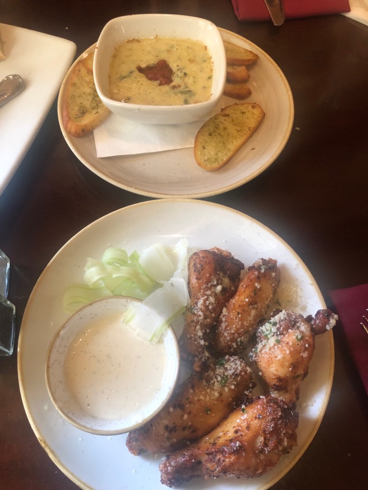 First up, we started with a couple of appetizers. I chose the Parmesan chicken wings and Abby chose the spinach artichoke dip. Both were good. The wings were grilled or baked and had a nice covering of parmesan and other Italian seasonings. They were not the best wings and did have a different texture than I was expecting, but overall they were a nice Italian take on a favorite. Next, the spinach artichoke dip was amazing. The combination is a classic and the little toasted Italian bread was a really nice addition for the dip to go on. The dip was warm and cheese had a nice ratio of spinach and artichokes throughout each bite. Out of the two, this is one that I would get again if it was on the menu. On to the entrees.
