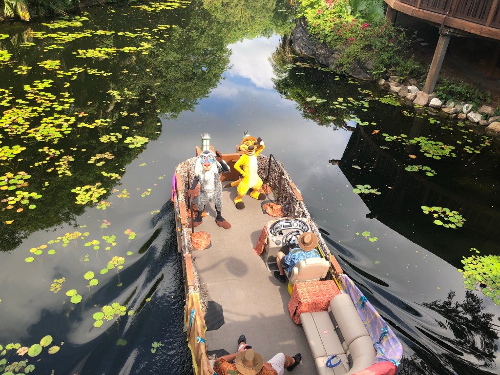 We did not catch many of these just because we never were around the route. But, we did see a couple of them and the one we captured was Timon and Rafiki. The flotilla (boat) cavalcade goes around the Tree of Life on the water and it is really fun to see them waving up to the bridges and pathways. It was a great way to utilize the water and character interactions.