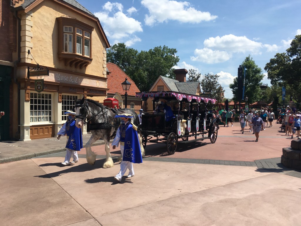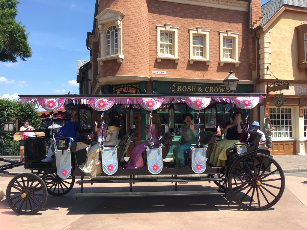We went over to Epcot and we saw the princesses again. The route goes around the World Showcase and the princesses are in a horse drawn carriage. It is a really cool cavalcade because they get pretty close to you and interact. This one was one of a kind and cool because it had a live horse pulling the carriage.