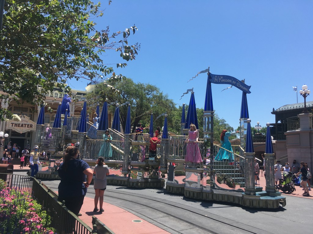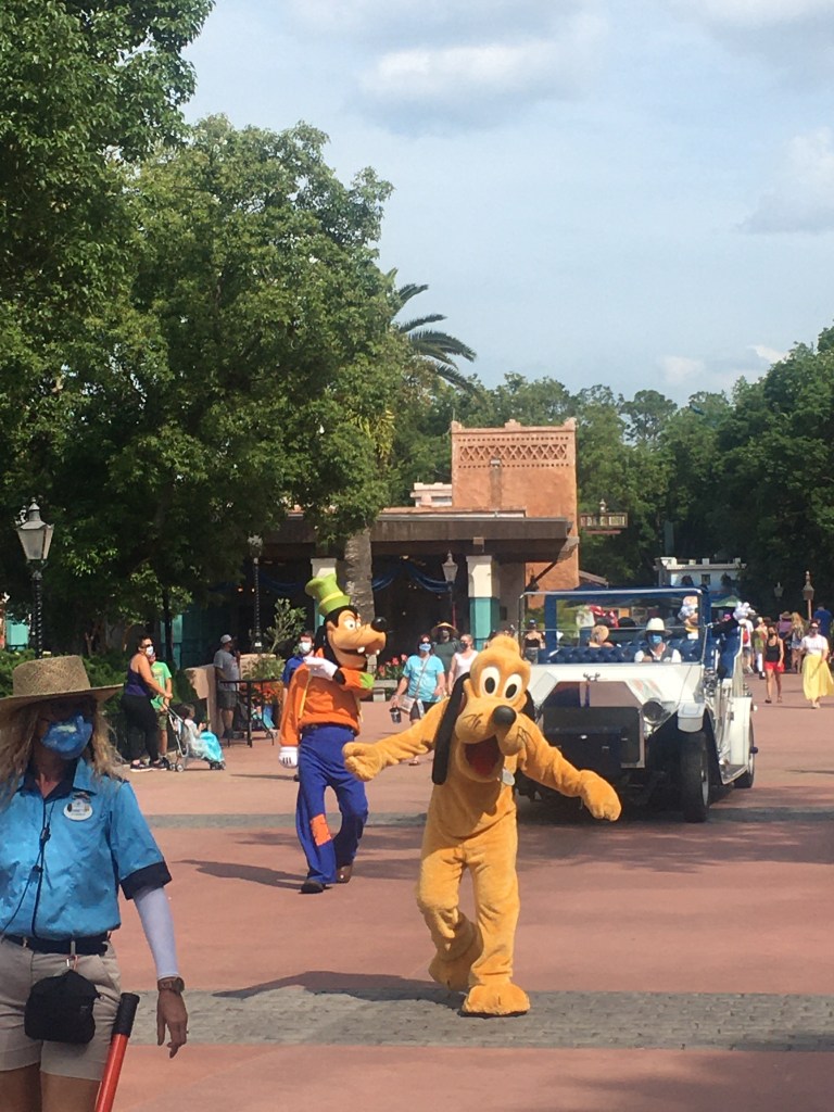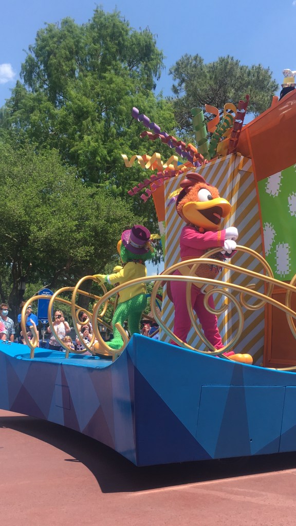 Hello friends and welcome back to another Muting and The Mouse. It is time to escape into more magic no matter how far you might be. For Abby and I, this has been fun to plan posts as we are reliving our vacations while sharing tips and thoughts with all of you readers. This post is a good one because it can spark a fun Disney conversation and opinion. Let’s dive into the topic here first. Disney is known for its parades. The music, the floats, the extravagant costumes. All of these make the Disney Parades some of the best. Well, during Covid-19, Disney re-opened up and did not have parades available for guests to see. I mean, rightfully so, it would have created areas of mass amounts of people gathering to see the parade. Instead, Disney came up with the idea to continue some cavalcades unannounced that would go through the parks. Now, you might ask, what is the difference and wouldn’t people still be gathering? Well, yes people would still gather a bit but it is hard to gather when it is the spur of the moment. The cavalcade is a short parade in a sense and it is of certain characters. We saw a good amount of them in the week we were there and they were all very fun and entertaining. They are all in different areas of the parks but have the same route, so you are sure to see them if you are along the route. The music starts and then you see the characters you know and love right there in front of you. I will go park by park and let you know who we saw and then give my final thoughts on them later on. But for now, let’s enter the parks and see who we found on our trip! There are more cavalcades than what we saw, but I will focus on what we saw at the parks.