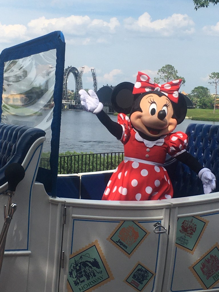 Mickey and Minnie are driving in a fancy car while Pluto and Goofy lead the way for them around the world showcase. This is a fun one once again because the characters are close and really provide interactions for videos and pictures. The music and the vibe in the showcase really is magical during this one.
