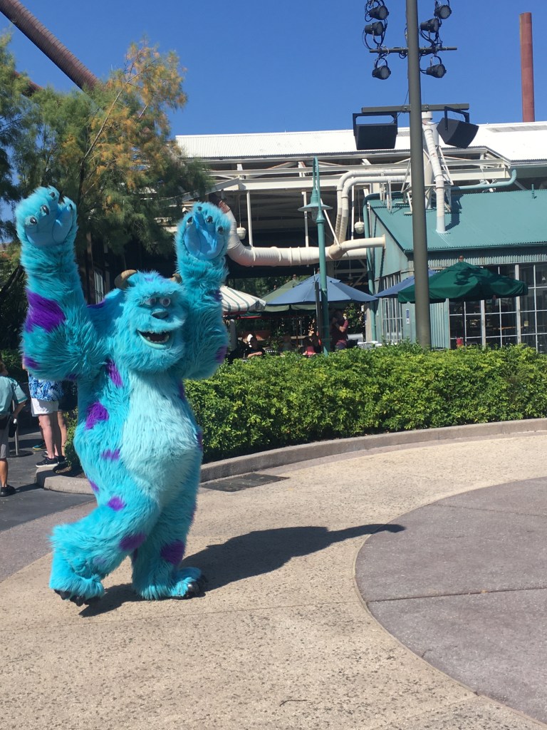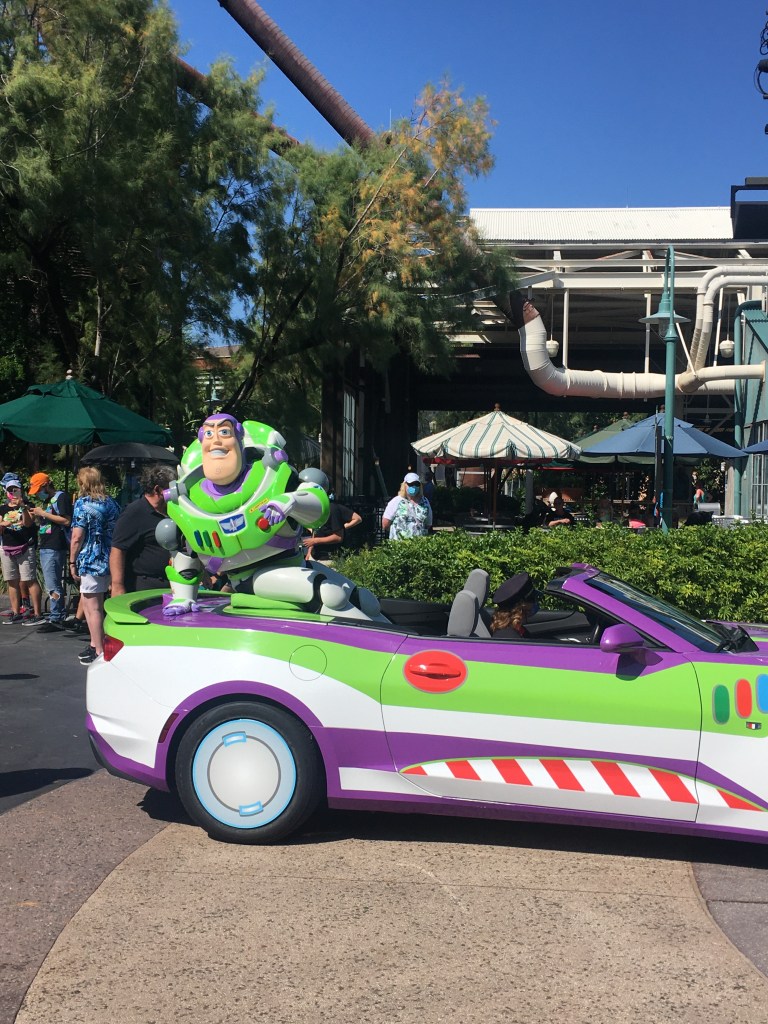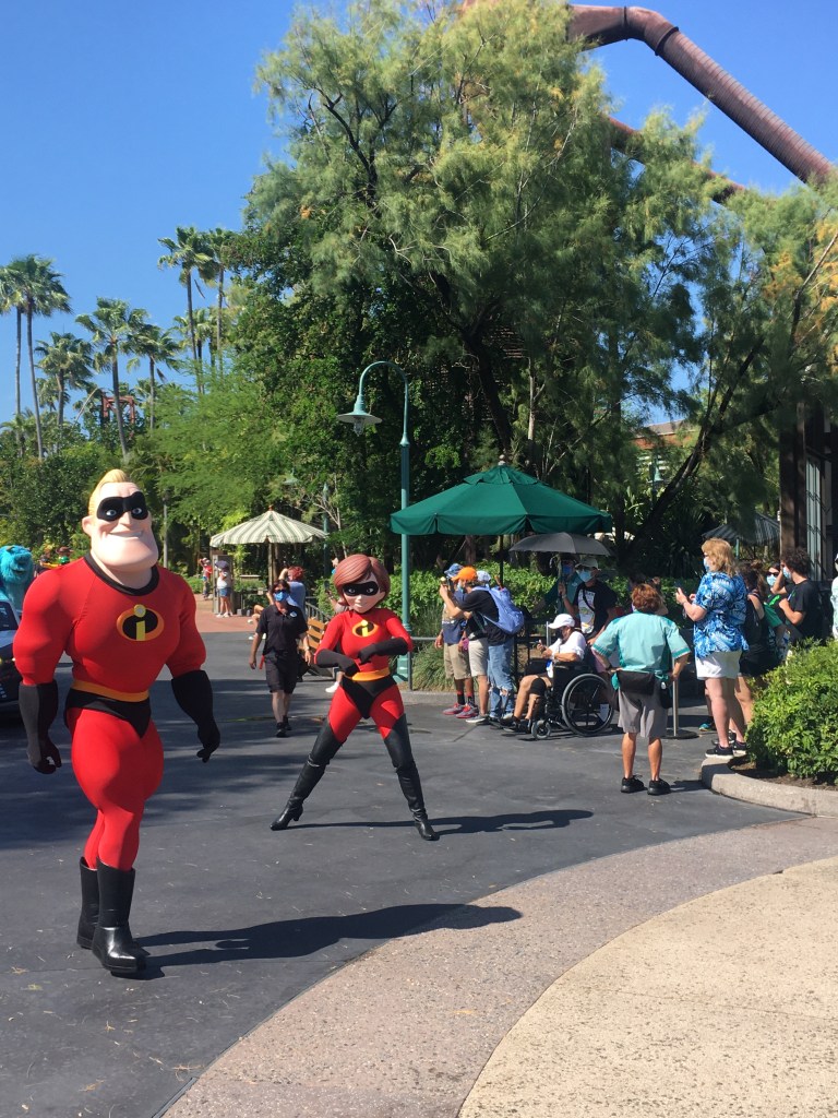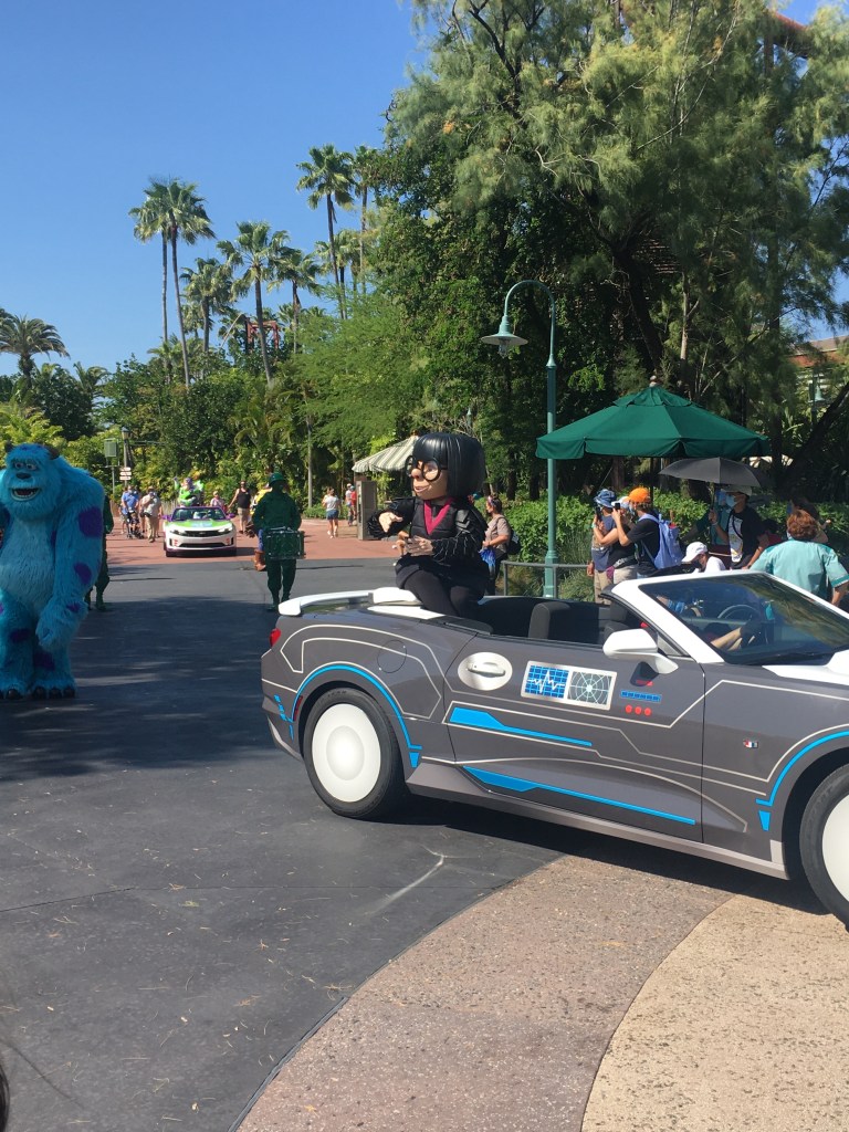 Over in Hollywood, we were able to see the Pixar legends. The Incredibles, Edna Mode, Sully, Green Army Men, Jessi and Woody, and Buzz all greet the guests as they walk from the front of the park back to the area where Star Tours is. This one is fun with the music playing and the Green Army Men playing the drums. They get close to you for interactions and Buzz’s car is pretty cool!