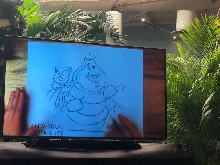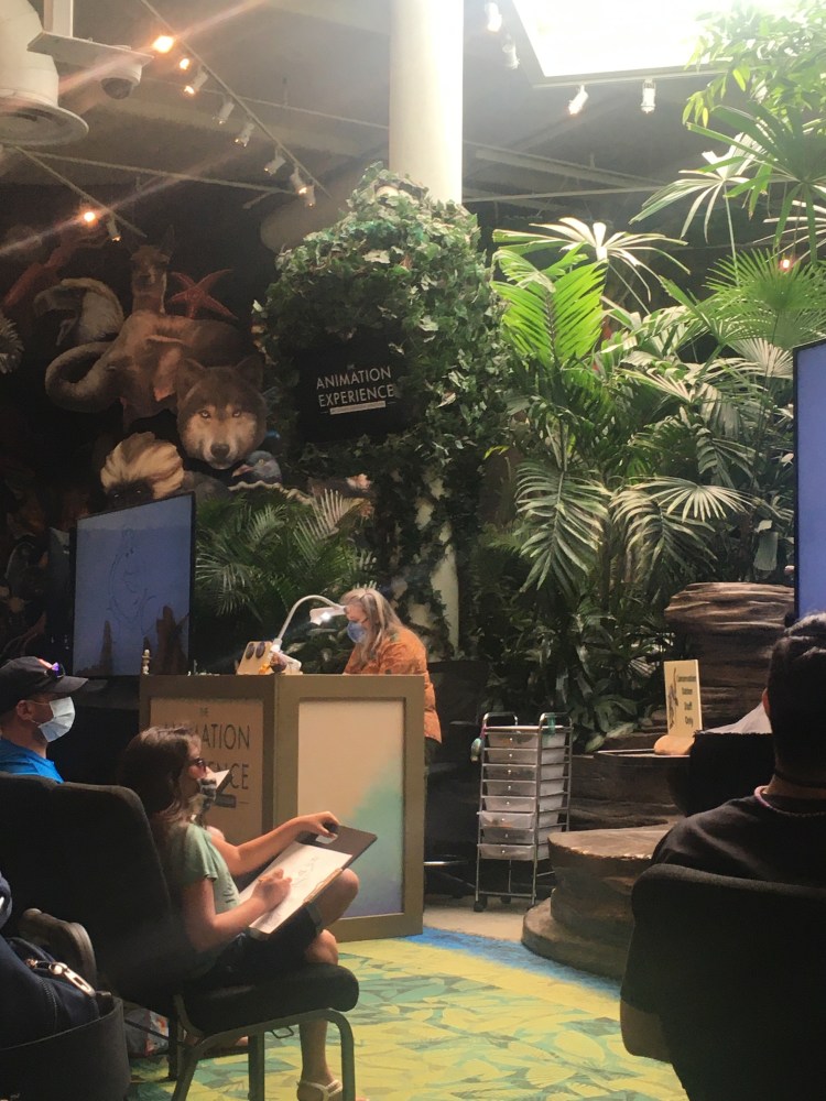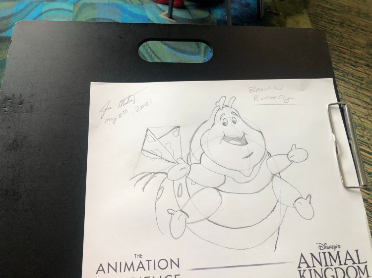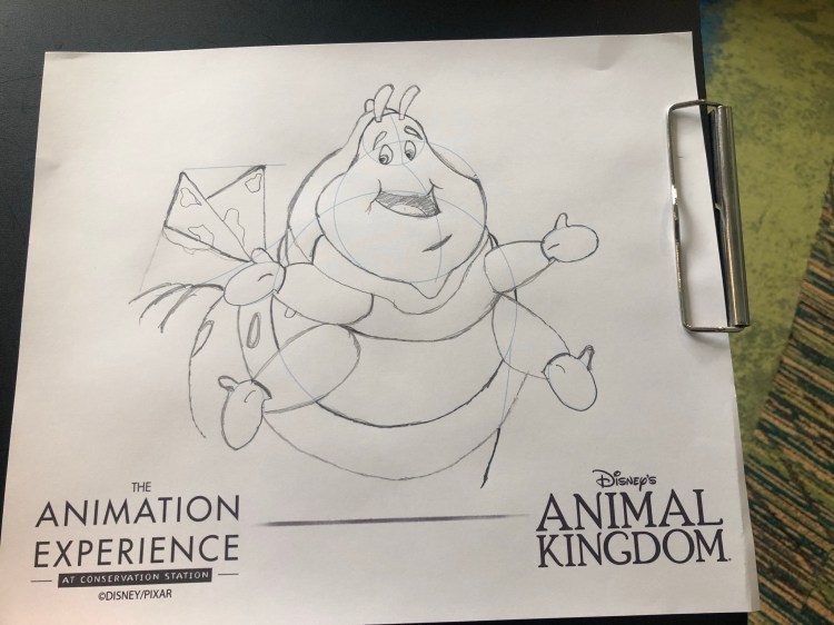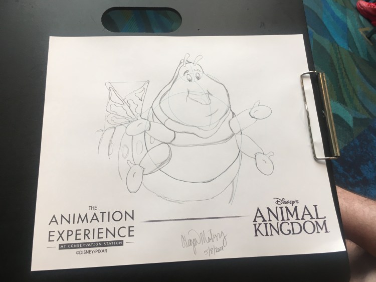 As you get in line the cast members hand you a clipboard with the paper on it and a tiny pencil. This is where the fun begins. You are seated in the “studio” and it is about time to get started. You are introduced to your animator and they teach you how Walt and the animators of the past used real live animals as inspiration to draw and make the characters to life. The video is pretty cool and really shows you how the animals tell the story in all of the drawings we see come to life. Once you feel inspired by this video, it is time to draw. Your animator is super fun. We have had a couple of different animators and they all take their time in teaching you how to draw. They start by telling you to have fun and not stress. Before long, each step is put down on the paper and your drawing comes to life. It is fun to take pictures of the process as you can see it come to life. Once you are done, sign that puppy and admire your work of art! The best part is, it is yours to take home. That is right, now you have some personal (insert name here) art to hang in your home. You cannot put a price on that if you ask me.
