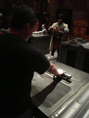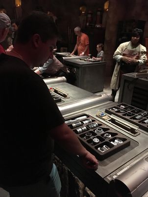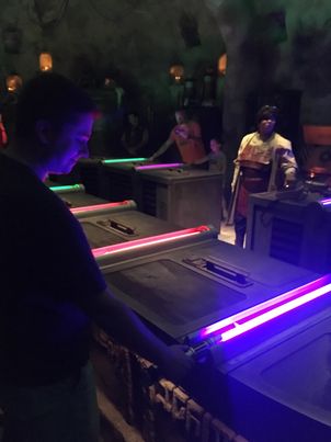 Once you have done this, your saber is complete. You insert the kyber crystal at the beginning and build around it from there. After you are done, you set it on a plate in front of you and wait for others to finish. Then once everyone is done, they explain that it is time to bring the saber to life. There you are interrupted for a moment. I will not spoil the surprise, but it gave me chills. Then the scavengers take your saber and insert it off to the side for activation. This is what really makes it all worth it. You are to activate your saber and on the count of three you are instructed to lift your saber into the air. The whole room is filled with awe as the room is illuminated by all of the lightsabers. The personalized lightsaber is complete and there is a part where they explain that now you are part of the Star Wars story. As you leave, you are given a nice carrying case to store the saber in. That completes building a lightsaber.