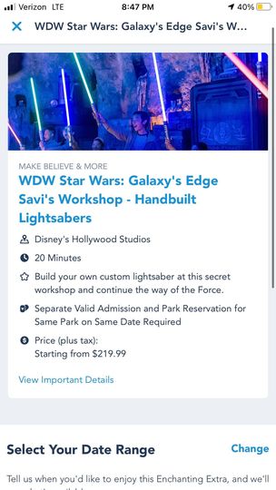 This can be done on the My Disney Experience App or on Disney’s website. Just search for Savi’s Workshop Handbuilt Lightsabers. Once you get to the page, you can hit the section where it says “check availability”. There you can pick your dates and time if available. You can book them 60 days out and I suggest you do that as soon as possible. If you are looking at doing this, the time slots sell out quickly so hop on it. Once you pick your time, you fill out the information they ask and it should pop up on your plans page on the My Disney Experience App.