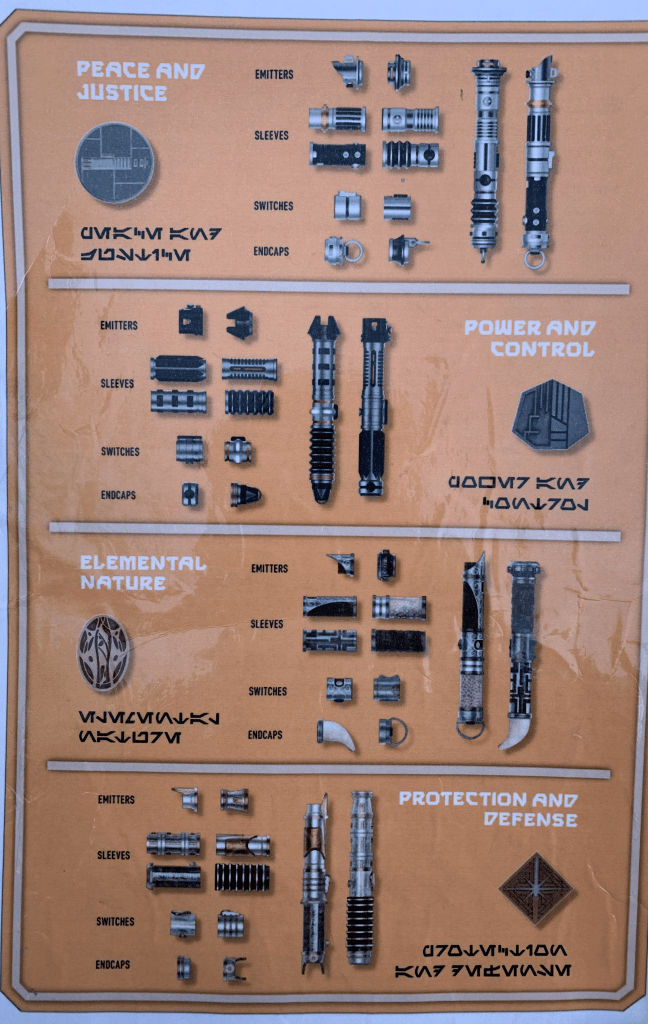 Once you get inside, the scavengers will give you a station to build your saber and the experience is underway. Once everyone is in, you meet the person who is going to lead the way in light saber making. They welcome you in and then give you a history of the jedi order and the lightsaber. Asking questions along the way where you can participate, this is a fully immersive part. They explain the kyber crystals and how they are the heart of the saber. Each color they have there has a story behind it. They explain what jedi used the colors and the effects are awesome during this part. After that, they explain that they have gathered all kinds of items for the lightsaber building. You get to choose from four colors. The colors are blue, green, purple, and red. I chose blue! From there, they put out some parts in front of you that correspond to which theme you chose. You get to choose from the following.