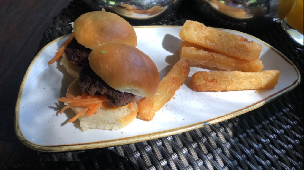 We had decided to split a couple of small plates for our lunch as we had planned to try another new place later that evening. We chose the Tiffin’s Bread Service. We like Sanaa’s Bread Service so much we wanted to try another one just for kicks. This consisted of some naan and assorted pita chips and crackers. it was accompanied by Red Pepper Hummus, Spicy Coriander Yogurt, Ginger-Pear Chutney. This was a nice little appetizer. The hummus was good and the chutney and yogurt also paired nicely. In my opinion, I liked the Ginger-Pear Chutney the best. From there we also ordered the beef sliders. This came with two sliders and some fries. The fries were the star of the dish. They were so crispy and unique. The sliders were good. Nothing to special about them but I would order them again. It was just enough food for the two of us and we really enjoyed them both. We would recommend both as they are easy to eat and did not fill us up to much.