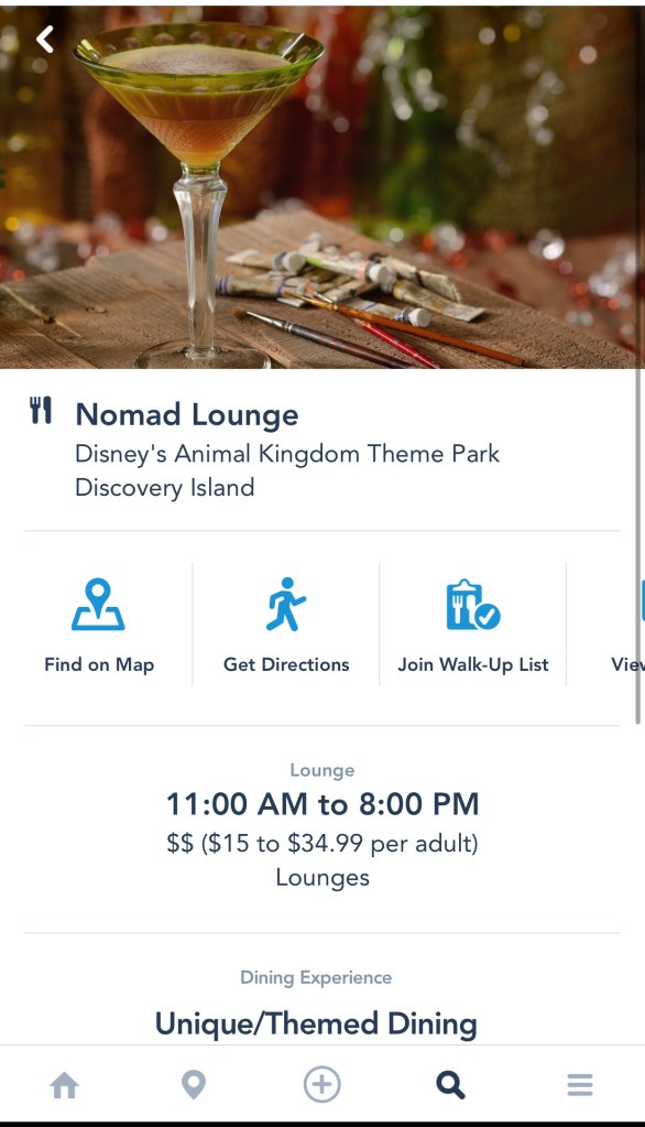Welcome back readers to Muting and The Mouse. We have been super busy and getting ready to share some news in the coming weeks, so stay tuned! For now we are going to dive right back into the magic of Disney dining! We are headed over to Disney’s Animal Kingdom for the next restaurant review. This is one that was a last minute add on to our last trip in September and I was very pleased. The Nomad Lounge is located right next to the restaurant Tiffins at Animal Kingdom. The restaurant is a nice little spot to take a load off, enjoy a drink, and have some small plates to satisfy that mid day hunger. The restaurant is open from 11 am to 8 pm. Lets dive into our experience and recommendations but keep in mind, some menu items can change!