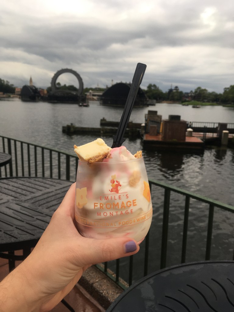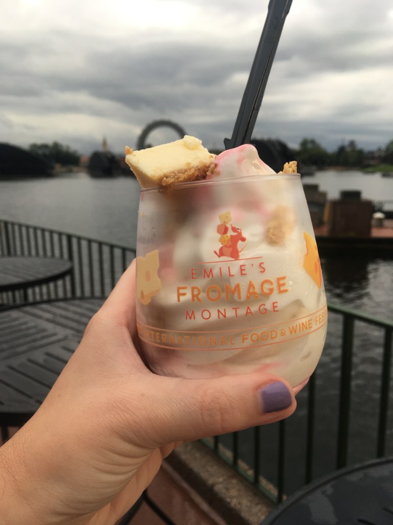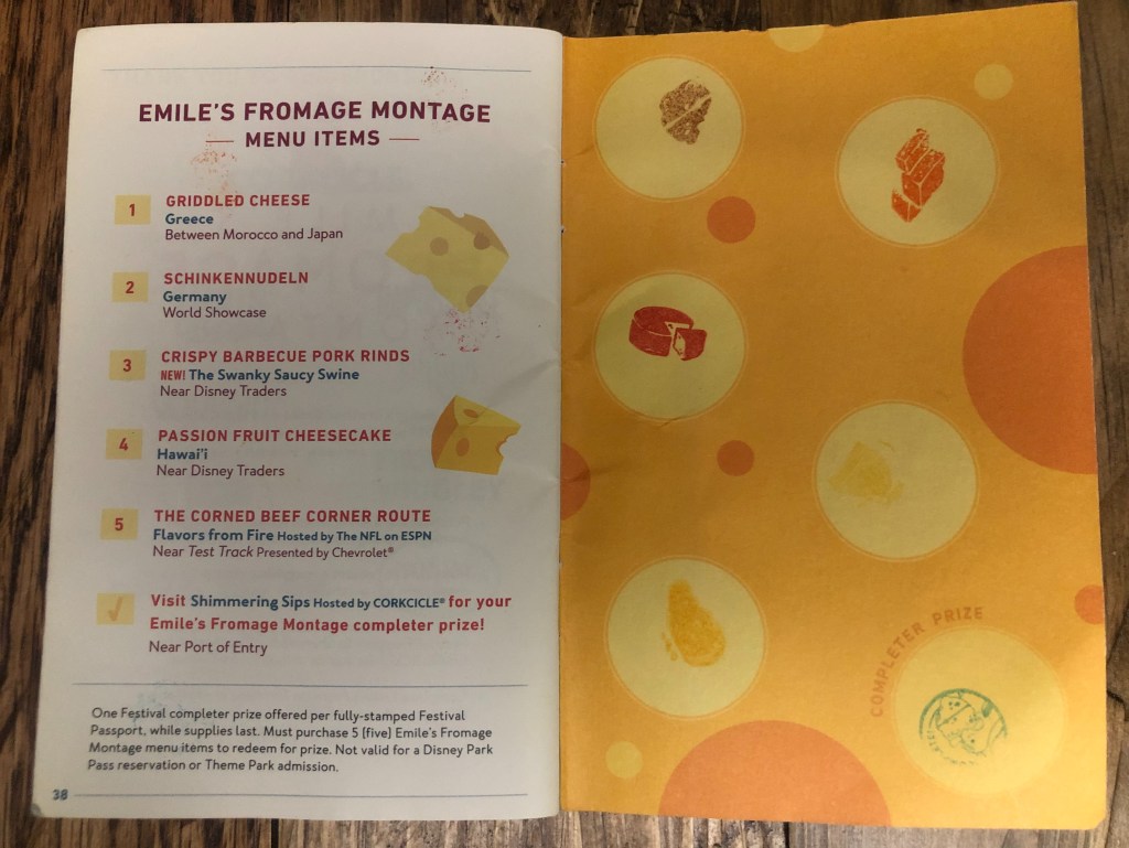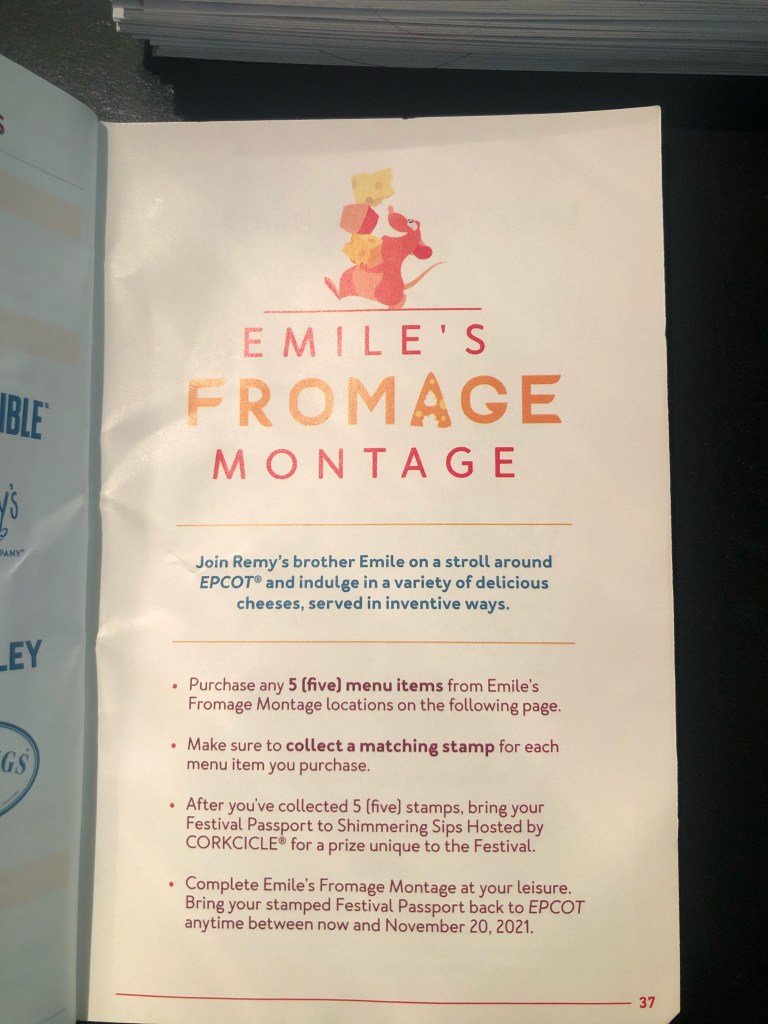 We were able to enjoy the Emile’s Fromage Montage around the Food and Wine Festival. The Food and Wine Festival takes place at Epcot around the World Showcase and is always a hit. They have different scavenger hunts and offerings and this so happens to be one of them. So, what is Emile’s Fromage Montage? Well, that is spelled out in the Festival Passport. It states “Join Remy’s brother Emile on a stroll around EPCOT and indulge in a variety of delicious cheeses, served in inventive ways.” Well, you had me at cheese. This is a basically a cheese crawl around the festival. All you have to do is purchase the five menu items spelled out on the page, get a stamp, and enjoy! Once you have received all five stamps, you can bring the passport to the check in and redeem a prize for completing the crawl. The menu items you need to purchase were spelled out in the back of the passport and we will cover them below.