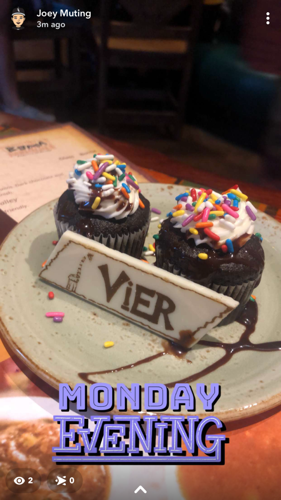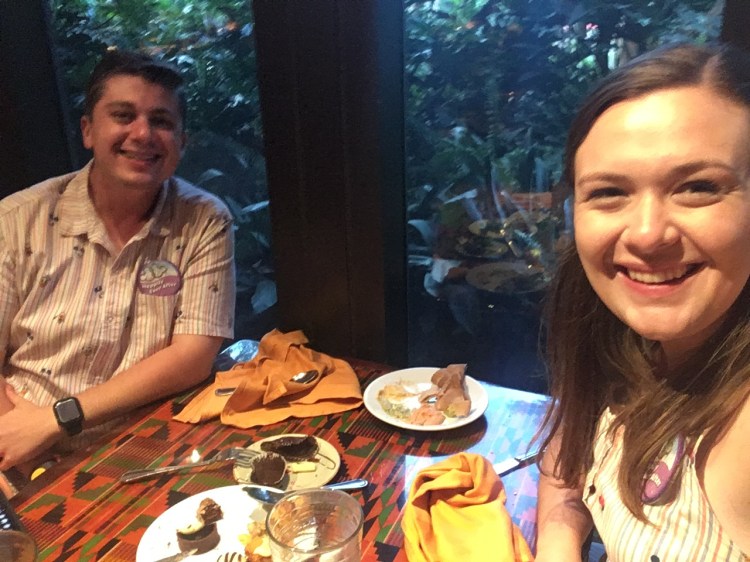 As we finished up our main meal, it was time to get some desserts. Animal Kingdom Lodge is known for a special dessert and here at Boma, it is an all you can eat! The special dessert is Zebra Domes. You can see the zebra looking desserts in the photo above and they are so good. If you are eating at Boma, these are a must try! The other desserts were a bread pudding with a vanilla sauce (which they ran out of, but it was good), Kenyan Coffee Tart, Passionfruit Mousse, Hazelnut Brownie, and a Pineapple Financier (like a pastry). The desserts were very good but if I had to pick a top three it would be 1.Zebra Domes, 2. Kenyan Coffee Tart, and 3. Hazelnut Brownie. You will want to make sure you save room as these did not disappoint us at all. As we were eating our dessert, our server brought us over a little dessert to congratulate us for celebrating our honeymoon. They were simple chocolate cupcakes with a white chocolate piece that says Vier (celebrate). This was so fun as they took time to help celebrate with us! If you are celebrating make sure you let them know and they will help make the celebration a great time.