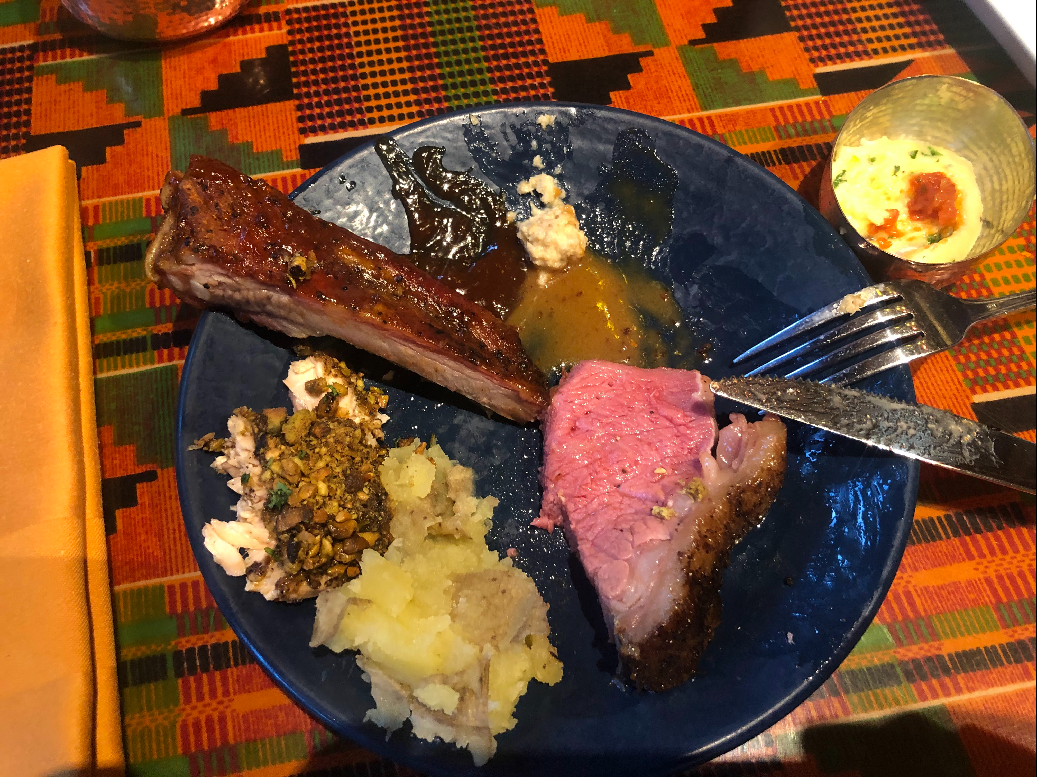 After our stew flight, we went up to get our main courses. There are so many options to chose from. We tried all of the meat options they had to offer as well as most of the sides. You can see some pictures of the food below.