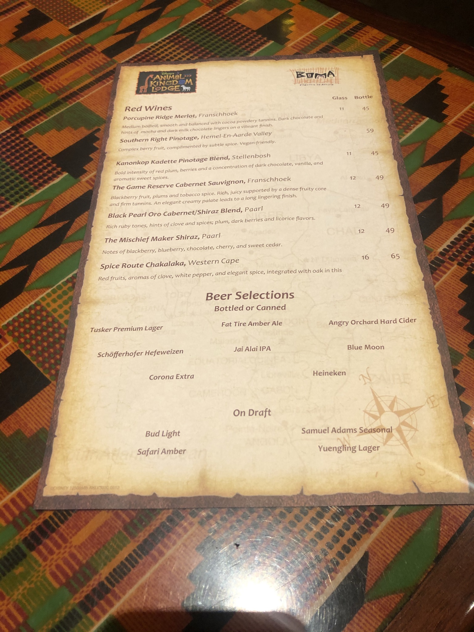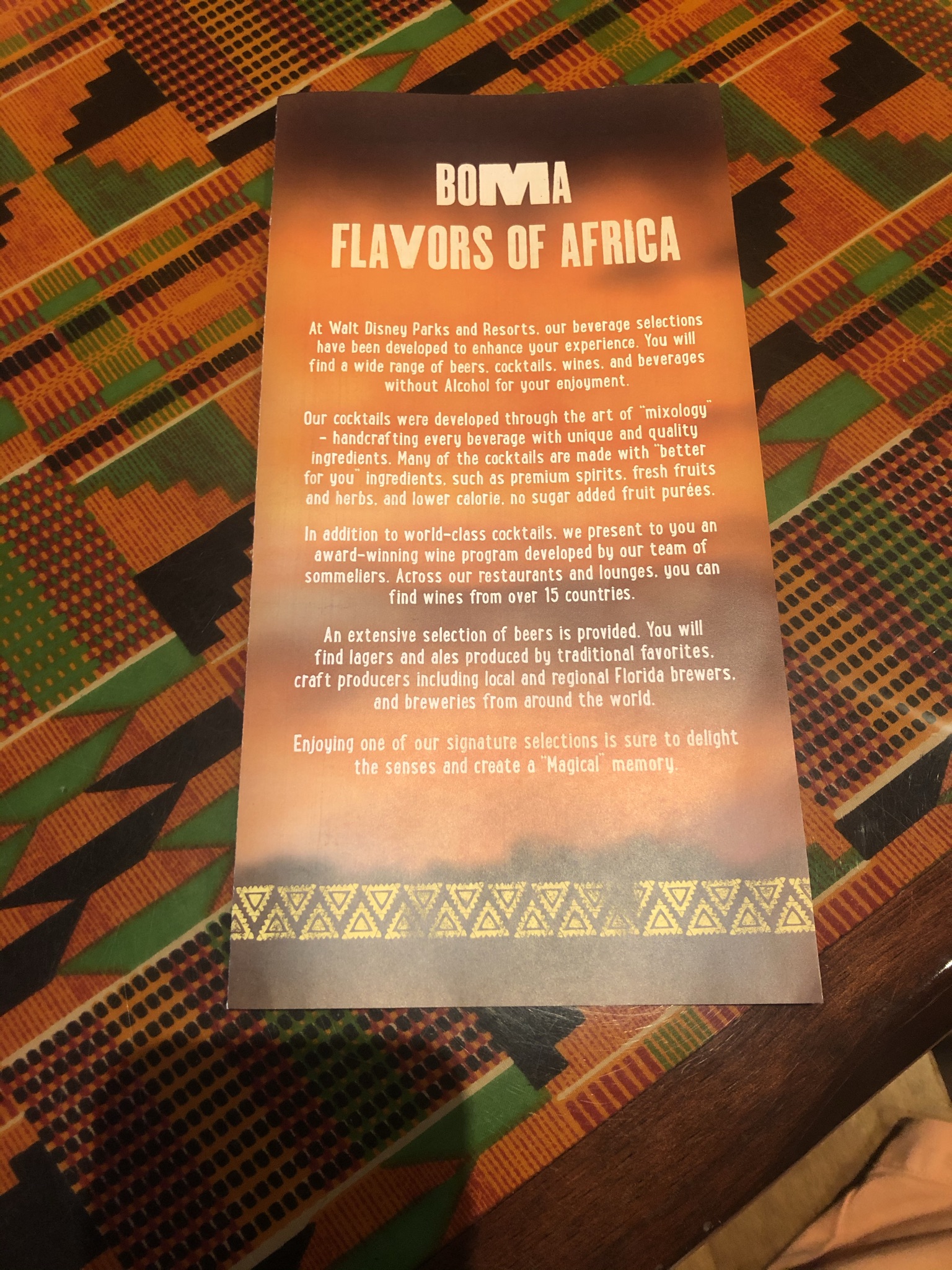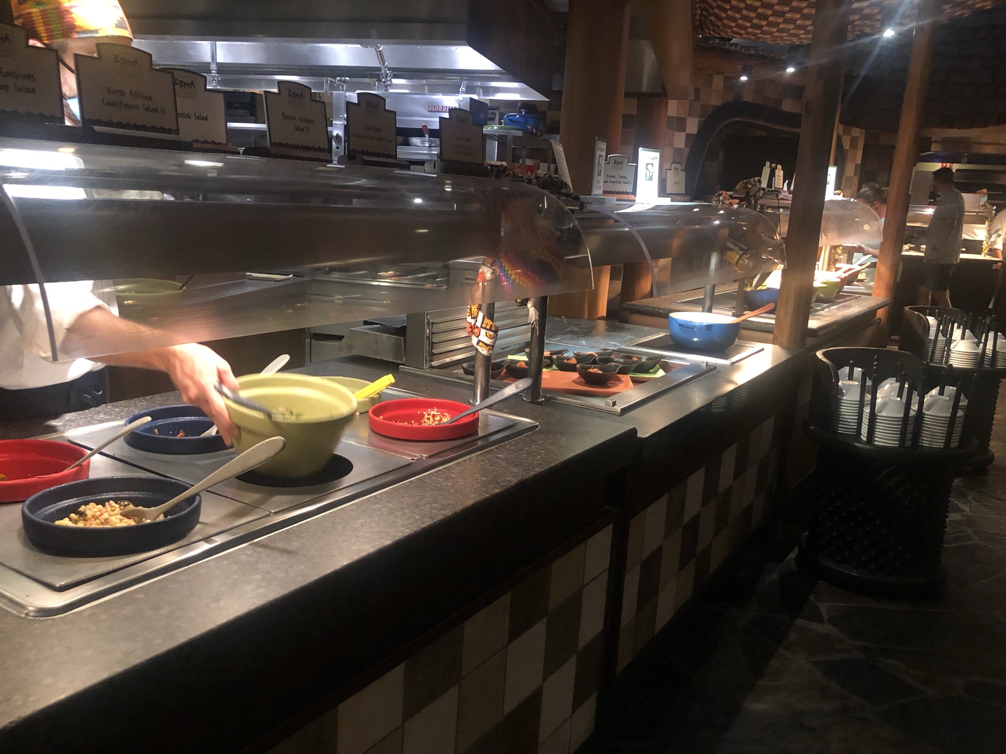 Boma is a restaurant that resembles a real life African Marketplace. There are some really cool features of the restaurant that makes you feel like you really are there. It features the classic thatched roofs where under you can indulge in some of the flavors of Africa as well as get some classic options for kids. The menu can change out but most of it has stayed the same since we have been there. For us, we were excited to check out the menu before the trip and then planned out what things we really wanted to try. You can check out the current dinner menu here. This is only a partial menu, but when you get to the restaurant, the servers do a really nice job of explaining the food options. They give you a couple of drink menus, an allergy menu if you noted an allergy, and then the server explains the buffet which includes some of their favorites. We ordered drinks before at the bar outside of the restaurant so we decided to just order some soft drinks to accompany our meal.