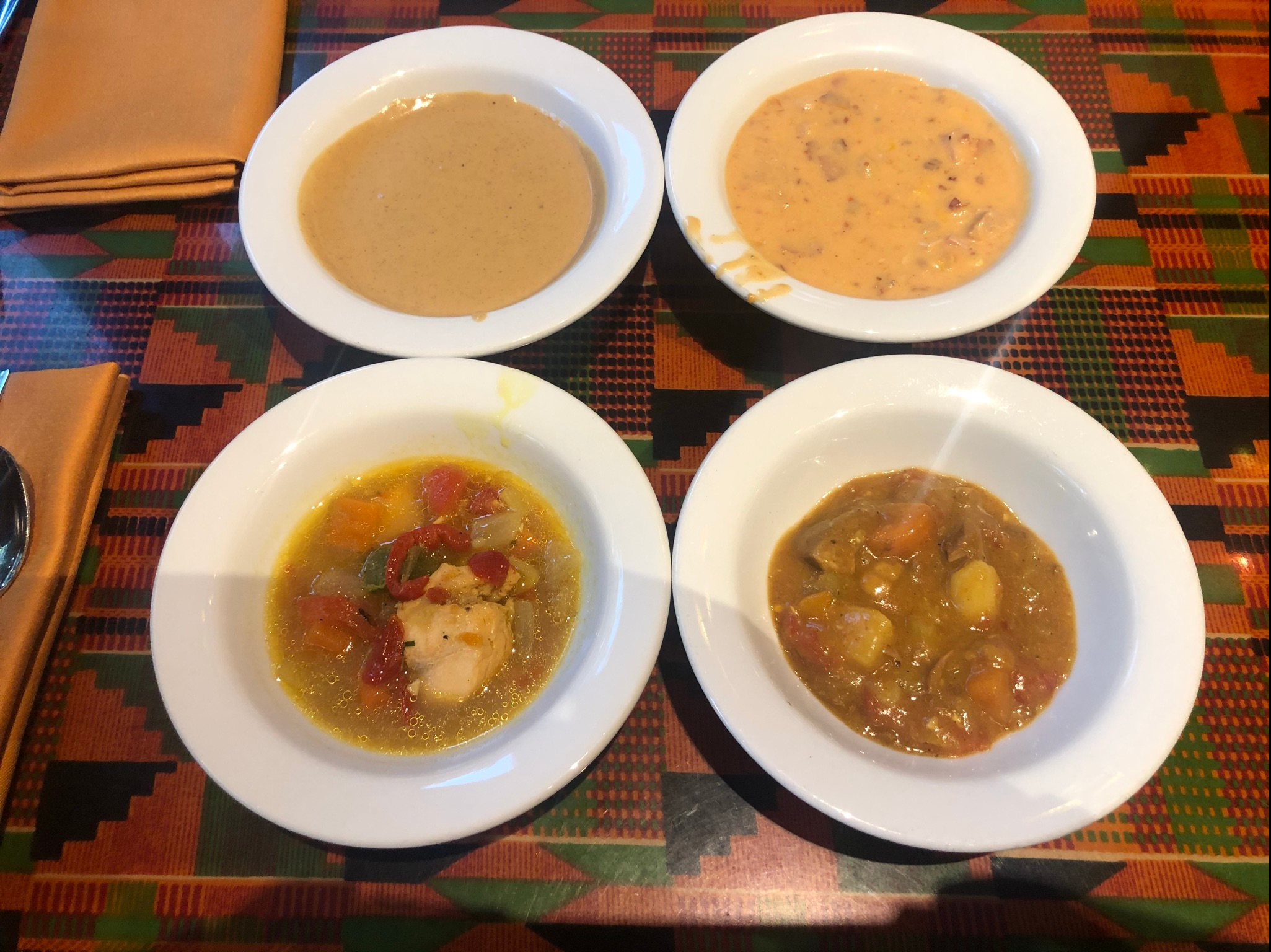 We started out with the lamb curry, this was a really nice stew. It reminded me of a classic beef stew but had the twist of some African flavors. If you like a good hearty stew, this would hit the spot. The next stew we tried was the seafood stew. The seafood stew broth was the star for me. It was so good and warmed you up. The fish was good and it was above my expectations. Third stew we tried was the chicken corn chowder, this was suburb. It was my second favorite of the four. The best for last, the butternut squash soup. This was our favorite and had a nice sweet with cinnamon flavor. Our server described it as “fall in a bowl” and that really was a spot on description. We liked it so much we tried a copy cat recipe when we got back home.