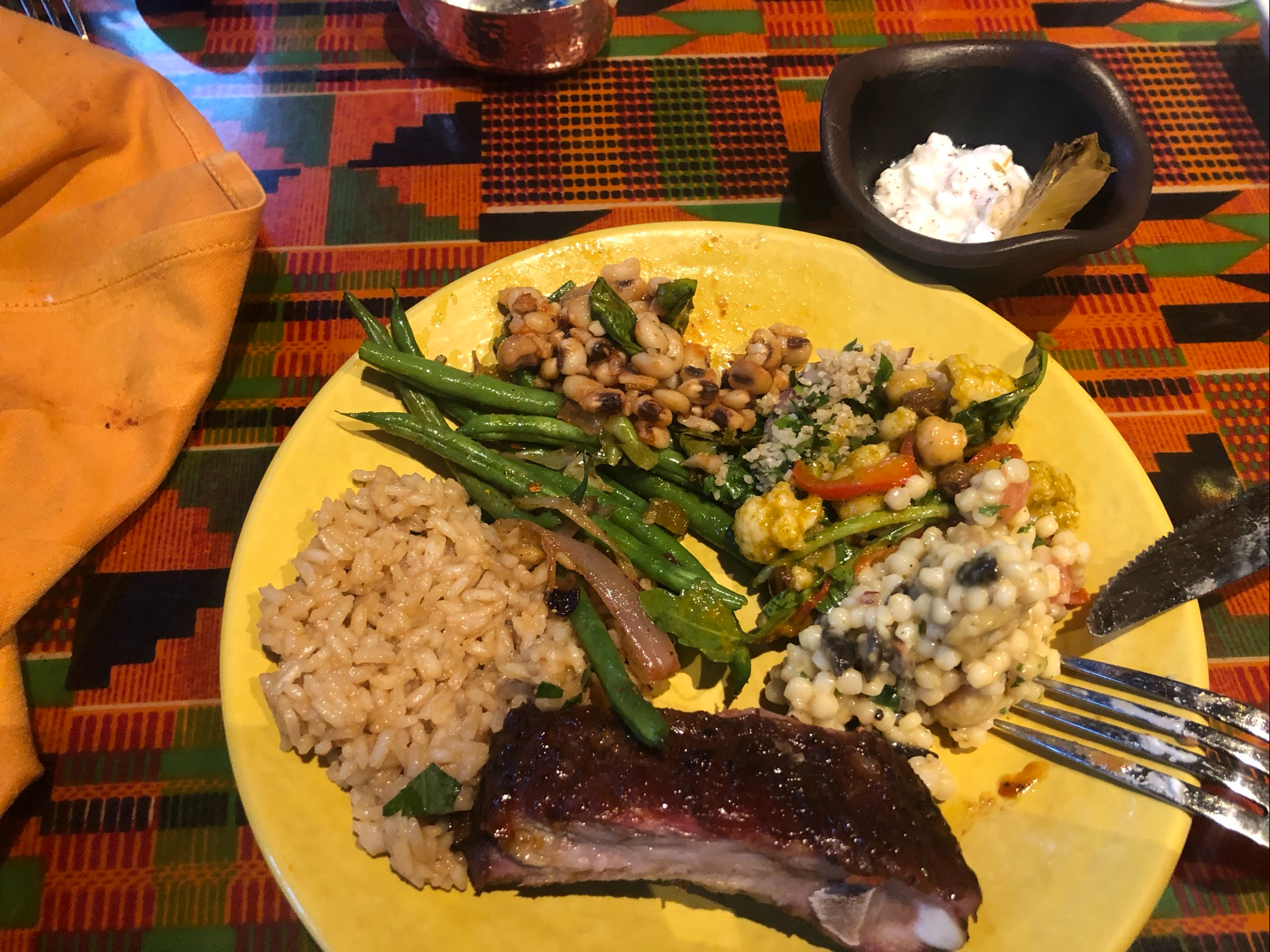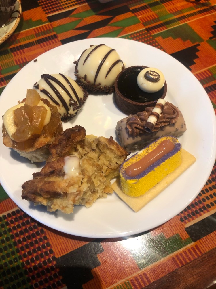 We are not going to go through the entire menu because who wants to listen to me talking about each dish when I am not a proclaimed foodie. I will hit my favorites on the list! Starting off we tried the Oak Roasted Pork Ribs. These were top notch. I went back up for more after we had finished them. They were very tender and the rub on them was enough. There were some sauces to have with them, but I did not think they needed them. Another good protein they had was the African Spiced Striploin. The rub on this was amazing and you can have them carve it for you right there. Moving on from the meats, there was the kiddy section. This included some of the classics all kids enjoy. Of course, we had to get them…for science! Yep, the science checks out, kids will enjoy what there is to offer. The sides were all so so good. Some of the top options included peanut rice, chickpea salad, sweet corn pudding, and the hummus! Out of these I think the one that stood out the most was the peanut rice. This was such a great flavor if you are able to enjoy peanuts. To me it tasted like the rice was cooked in peanut butter and it just was to die for. The hummus was delicious and there was a couple of different kinds to try for all. Overall, I think the options were plentiful and they were all pretty good. Do not get turned off by the “african flavors” because there really is something here for everyone. Now, on to dessert!