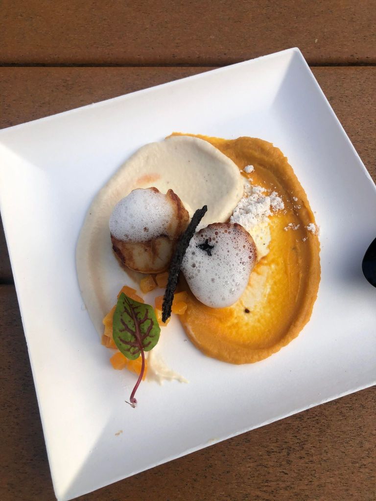 Number one is here and I bet you are asking what could top out the Chicken Shumai? Well, here we are at the Artist’s Table in the America Pavilion for our number one dish! The Pan-Seared Scallops with Vanilla-Butternut Squash Puree, Brown Butter Cauliflower Puree, and Lime Foam was the best dish in my opinion. Once again, I did not have high hopes because it is tricky to cook the perfect scallop and being at a festival, I did not think it could be achieved. But, my scallops were cooked perfectly. They were so tender and the lime foam added a nice touch to the seared scallop. The puree’s were very good as well. They were so silky smooth and had really nice flavor. They kind of stole the show for me and really set it apart. I almost went back for more!