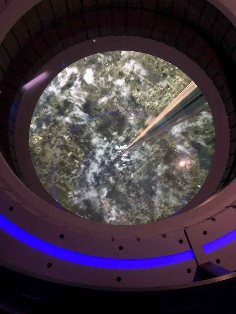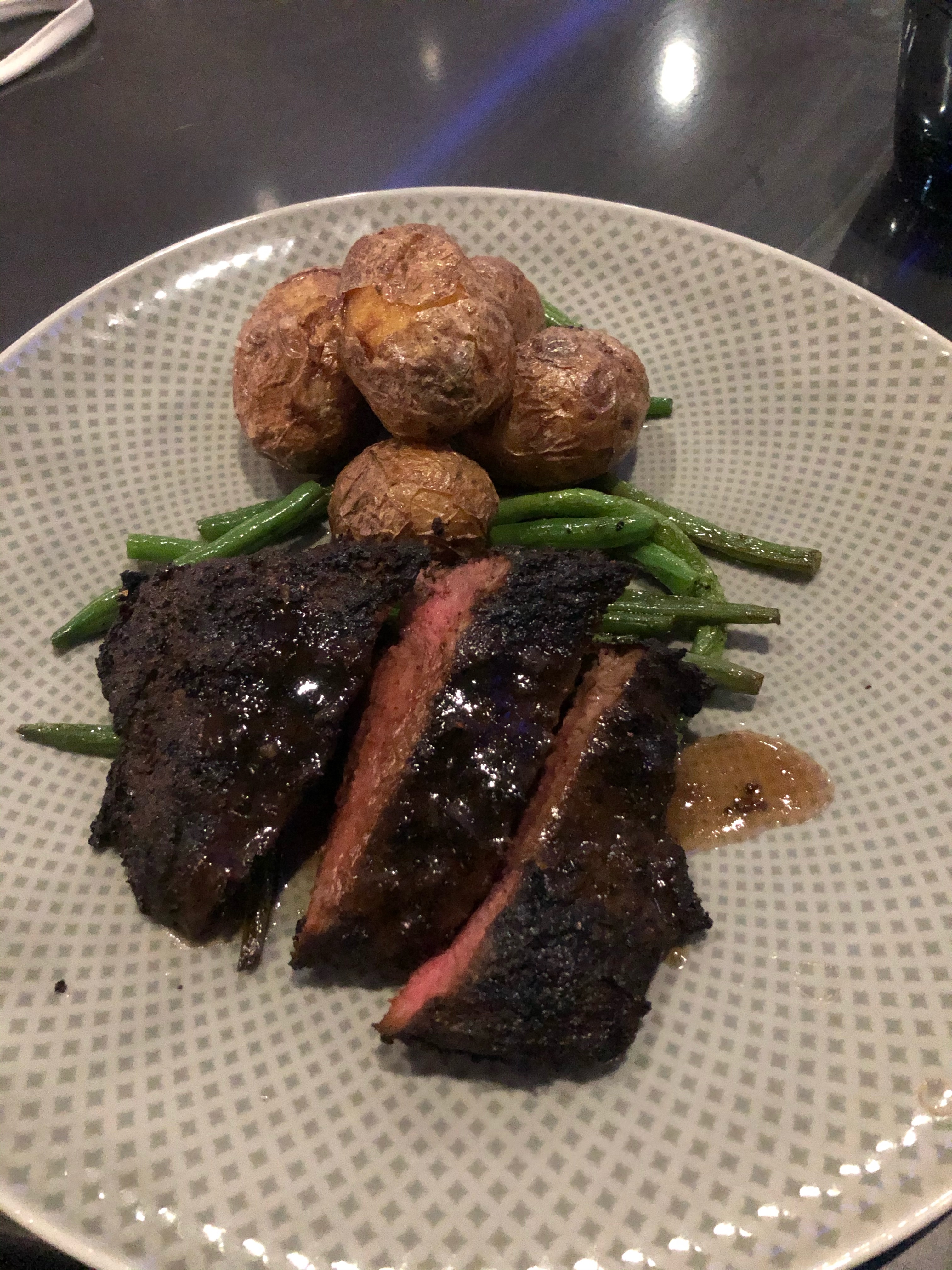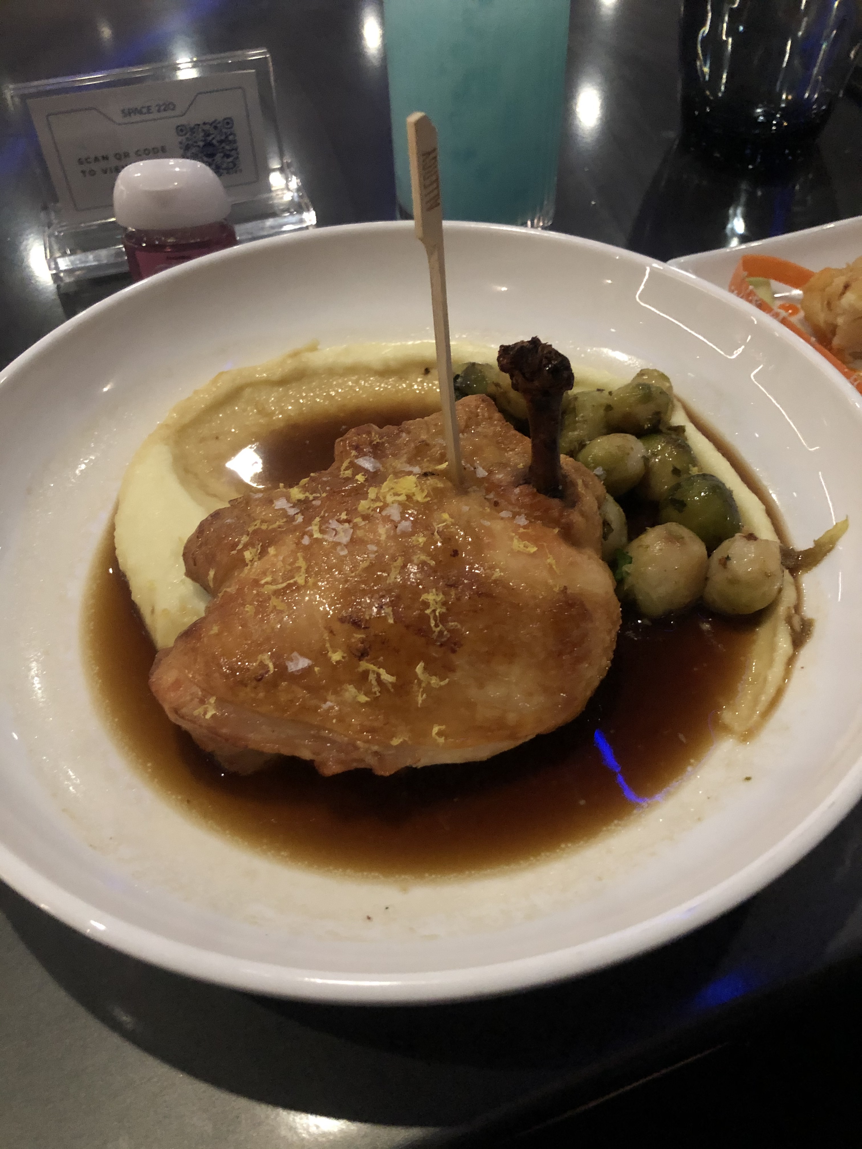 Our main course options were simple. We had figured those out early on in the process. I decided to go with the Flat Iron Steak. This dish featured Coffee Space Rub, Smashed Fingerling Potatoes, Cabernet Butter, Haricot Vert. Now my potatoes were not smashed, but I did that myself. This was pretty good. The flavor of everything was outstanding, however my steak was a little tough. Overall, a pretty good dish I would get again. It was cooked perfect to my liking but the toughness was still there. Abby ordered the Roasted Free-range Chicken. She has a seafood allergy that we marked so we did notice it was served differently than most pictures of it show. It consisted of a roasted chicken breast Mashed Potatoes, Brussels Sprouts, Roasted Garlic Thyme Jus. The chicken is typically served in roulade form for reference. The dish was very good, the star was the crispness of the chicken and the mashed potatoes. I think we were both shocked by how good it was. After we finished eating we took some more time to take in the sights of the Earth in the windows and payed the bill. The views were so fun we took our sweet time and enjoyed. See some of them below.