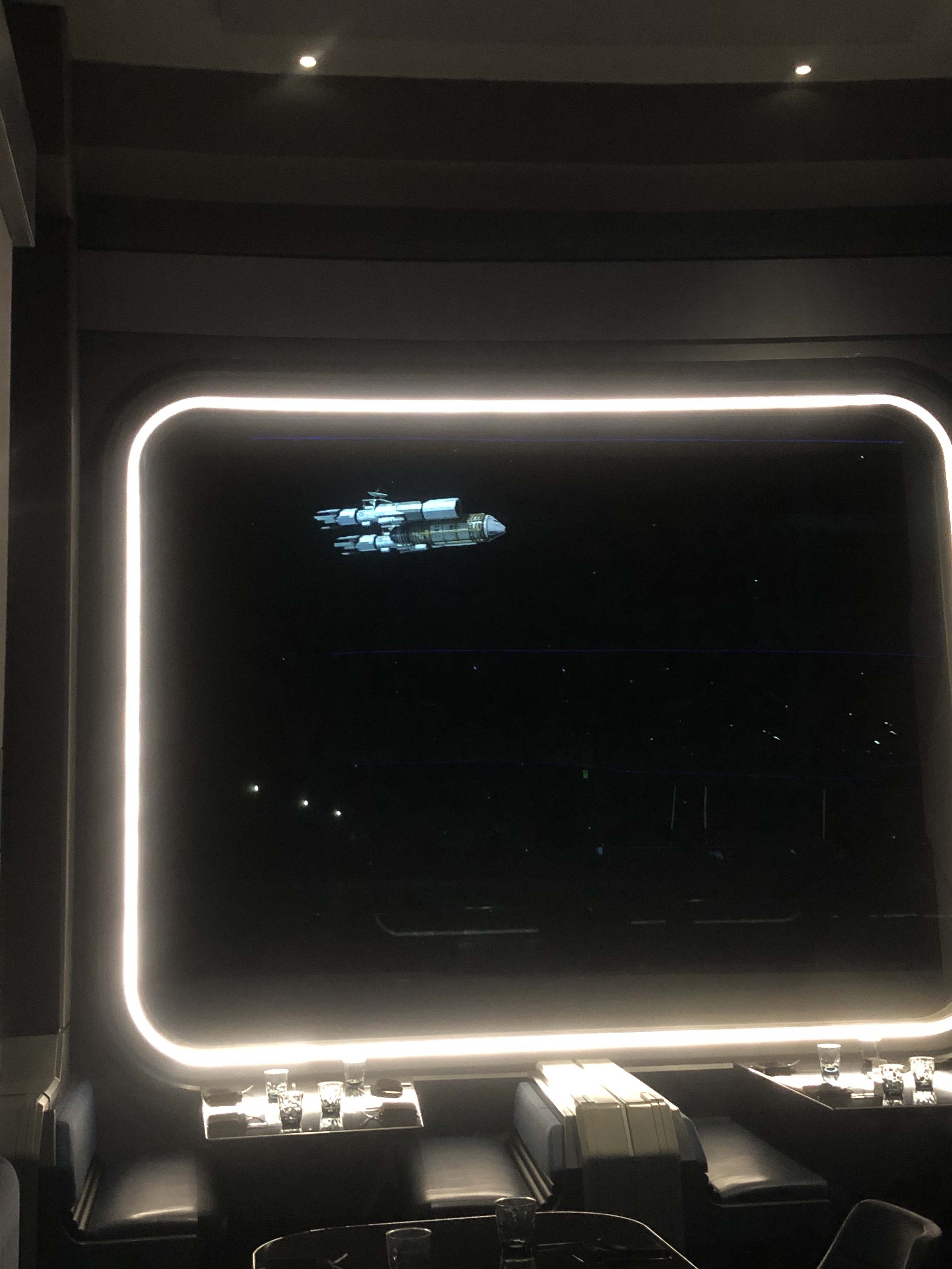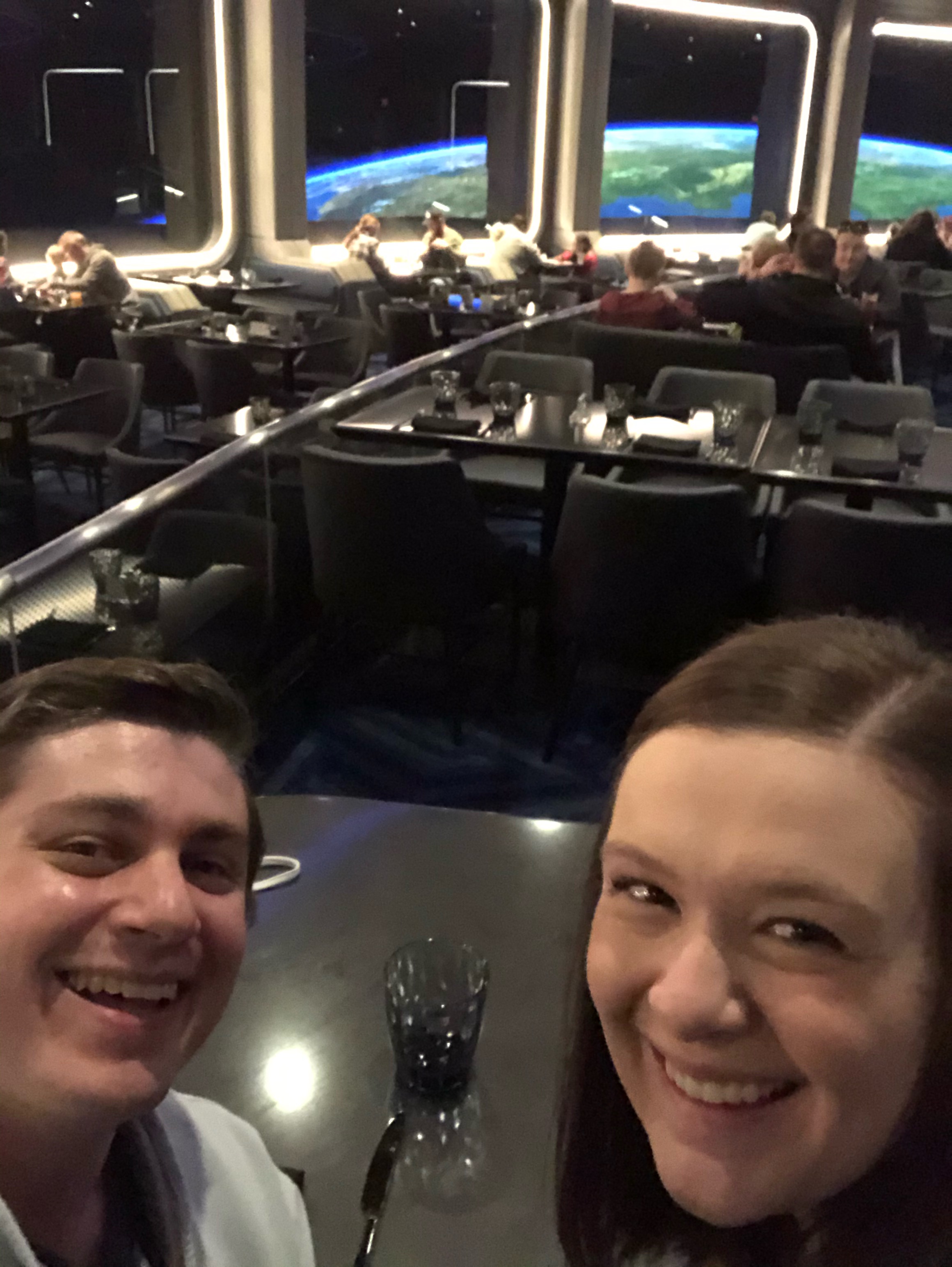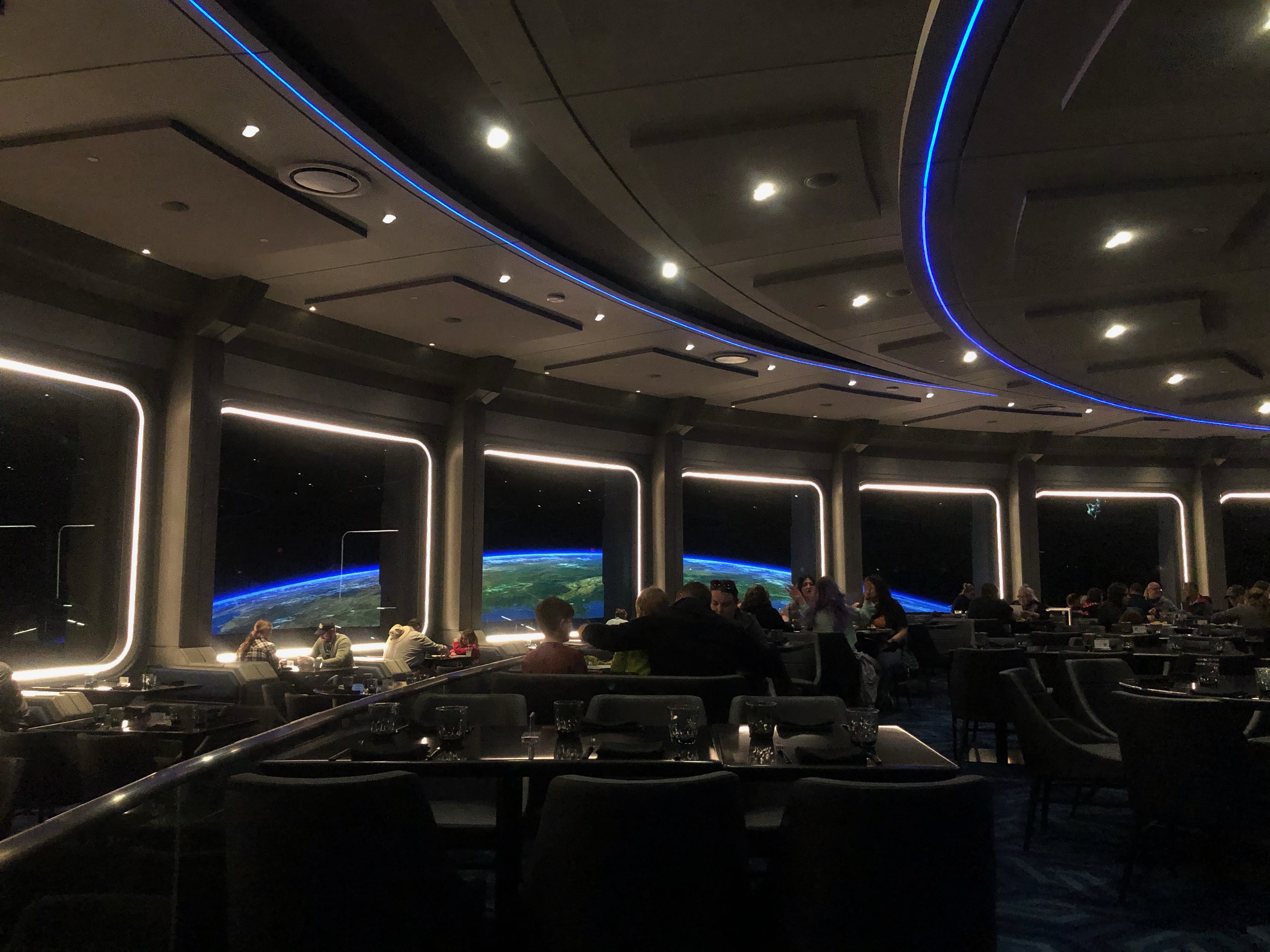 It does not last a long time at all. It is so scenic and fun to see Florida as you race up to the space station. Once you get off the elevator, the theming begins. You see the space plants and vegetables being grown and you can tell big things are around the corner. As you are guided to your seat, take it in. The view of Earth is amazing. Not much else to say! We had a great seat if you ask me. We were sat on the upper level along the guard rail. This was really cool to have this seat because you could see all of the windows across the back of the station. Most people think it would be best to sit next to a window but if you are there, you only see that window. The fun is seeing all of them as there are different scenes you can see. Once we took some photos and got settled, it was time to order.